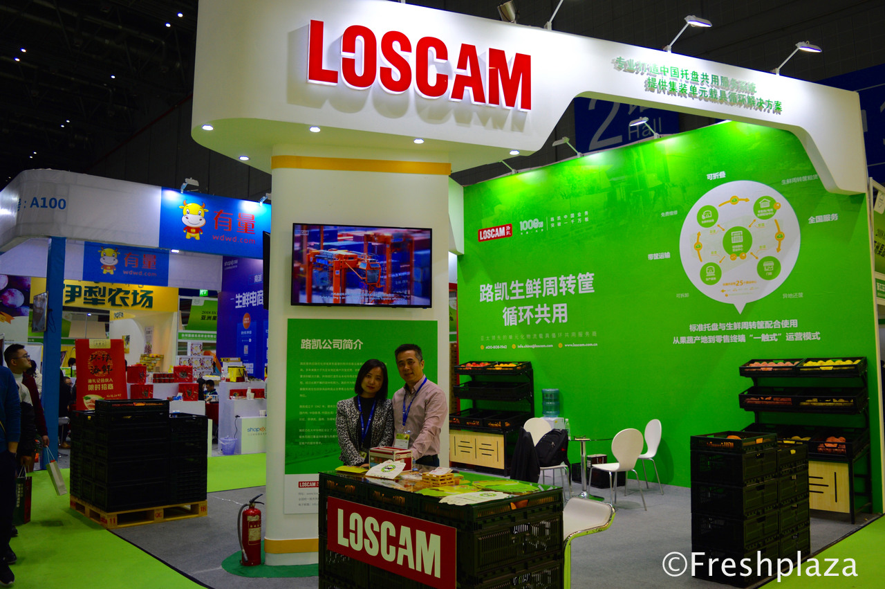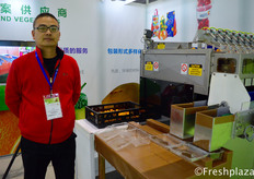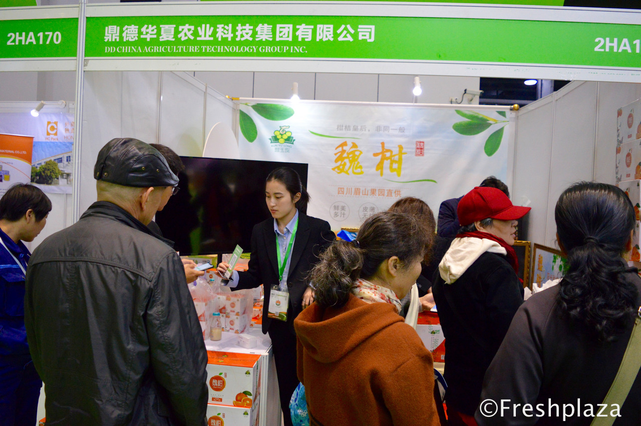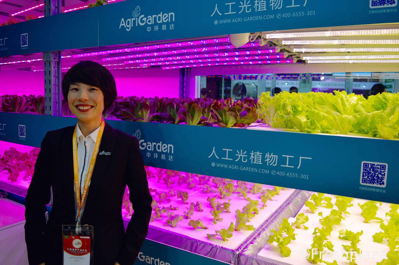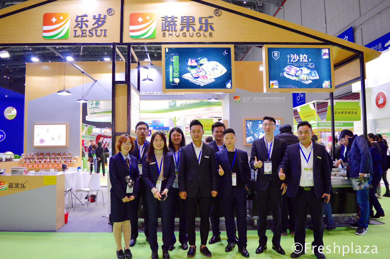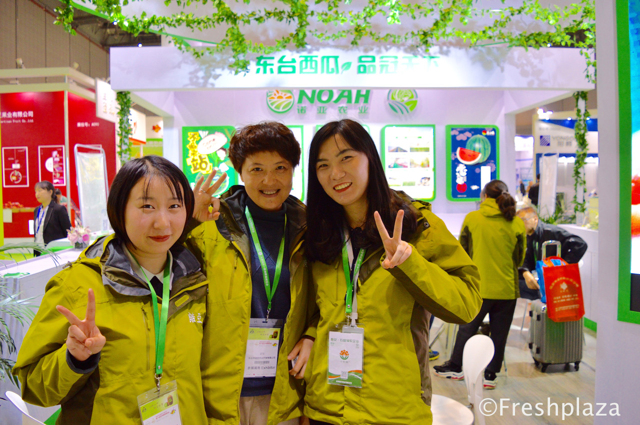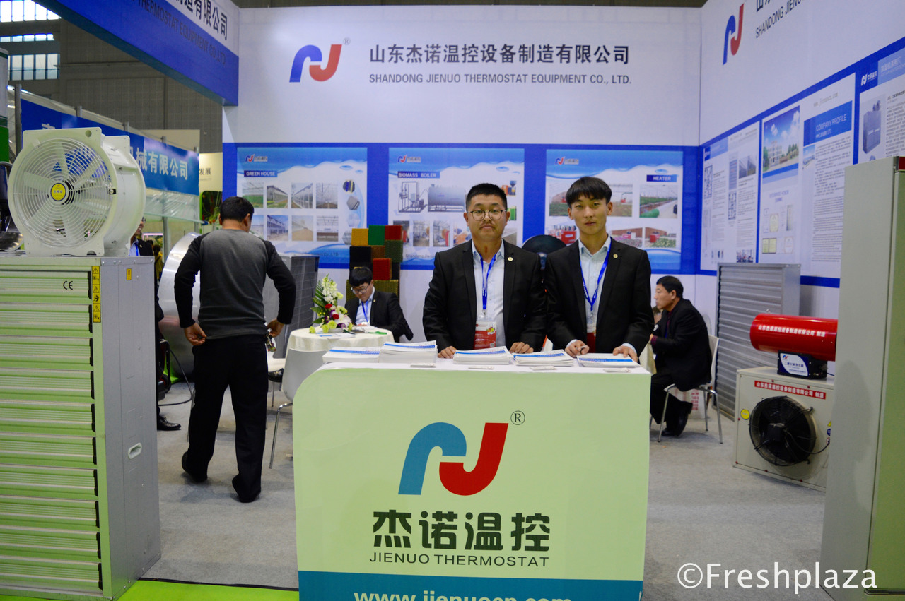 The large booth of Shandong Shouguang Vegetable Industry Group Co., Ltd with Mr. Zhang Qinghu. They are specialised in vegetables, they control the whole chain, from seedling to selling and distributing on the wholesale market. // 山东寿光蔬菜产业集团有限公司的大型展位以及该公司的张清虎。他们专门从事蔬菜运营,控制整个产业链的运作,从批发市场上的幼苗销售到分销。