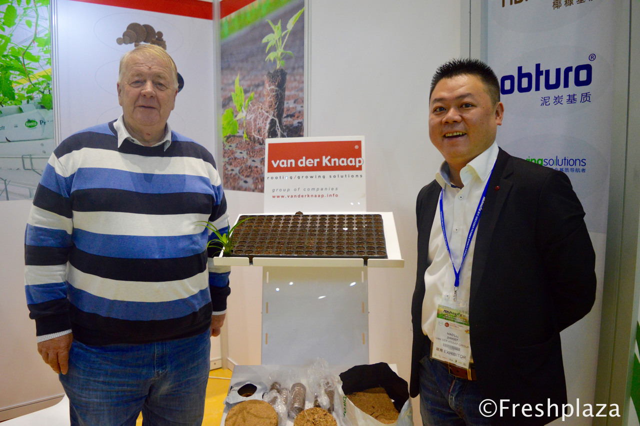 William J. Kuijpers from Delflandasia B.V., which delivers services as update existing greenhouses, turn key projects, new project consultancy and supervision of greenhouse installation. He is together with Mao Liu from van der Knaap who can deliver rooting and growing solutions. 来自Delflanda.B.V.的William J. Kuijpers,该公司提供更新现有温室、交接关键项目、新项目咨询和监督温室安装的服务。他和Van der Knaap的Mao Liu在一起,Van der Knaap提供生根和生长的解决方案。
