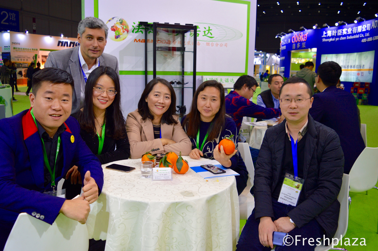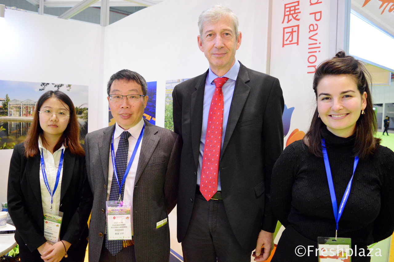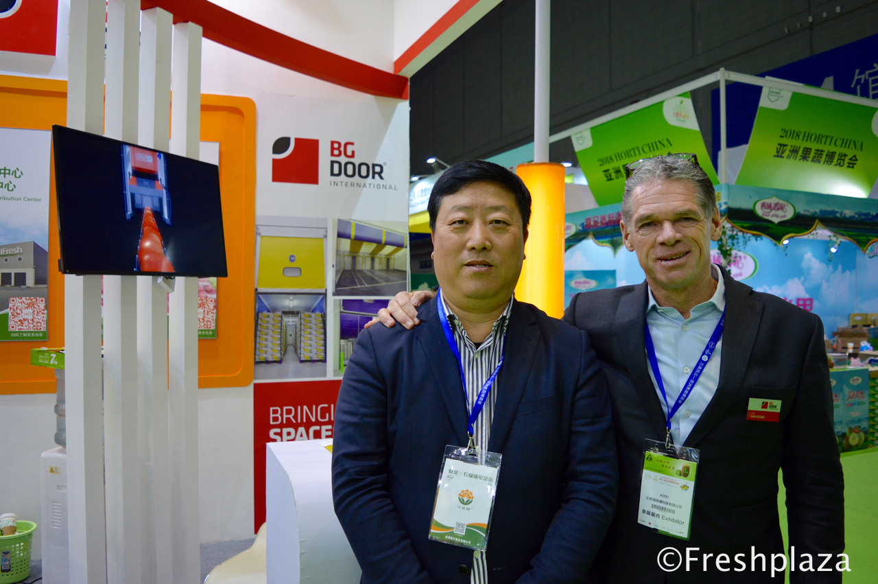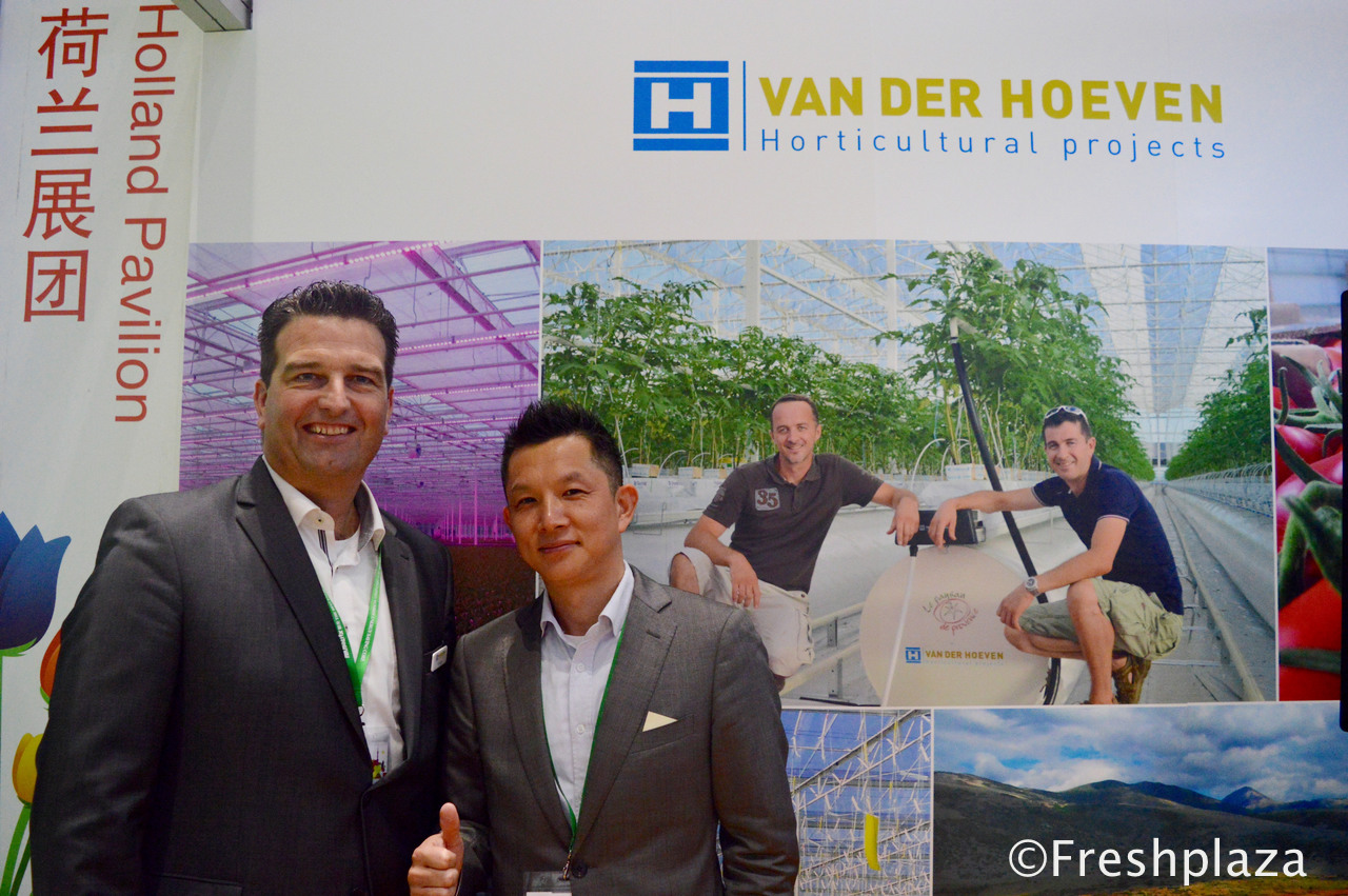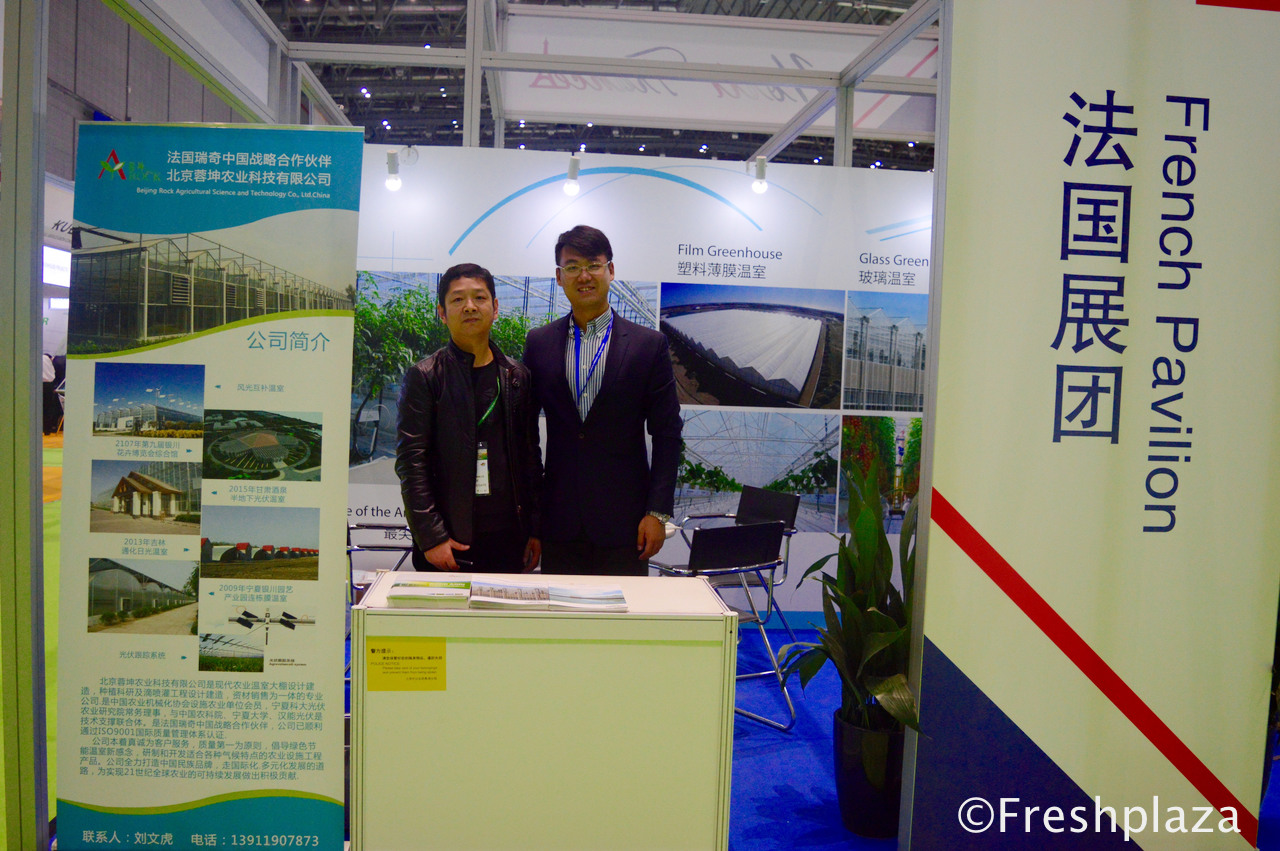 Left Mr. Liu Haitao from Beijing Rock Agricultural Science and Technology Co., Ltd., which is a high-tech greenhouse company specializing in the design, production, sales, installation and technical services of modern agricultural facilities (greenhouses, greenhouses, irrigation). And to the right Yue Li from Richel Group, which design, manufacture and develop complete greenhouse and shelter solutions for agriculture, construction and industry on a worldwide scale. 左边是北京蓉坤农业科技有限公司的采购部经理刘海涛,该公司是一家专业从事现代农业设施(温室、温室、灌溉)的设计、生产、销售、安装和技术服务的高科技温室公司。右边是法国瑞奇集团的中国地区负责人李岳,该公司在全球范围内设计、制造和开发了农业、建筑和工业设施的温室和遮蔽解决方案。