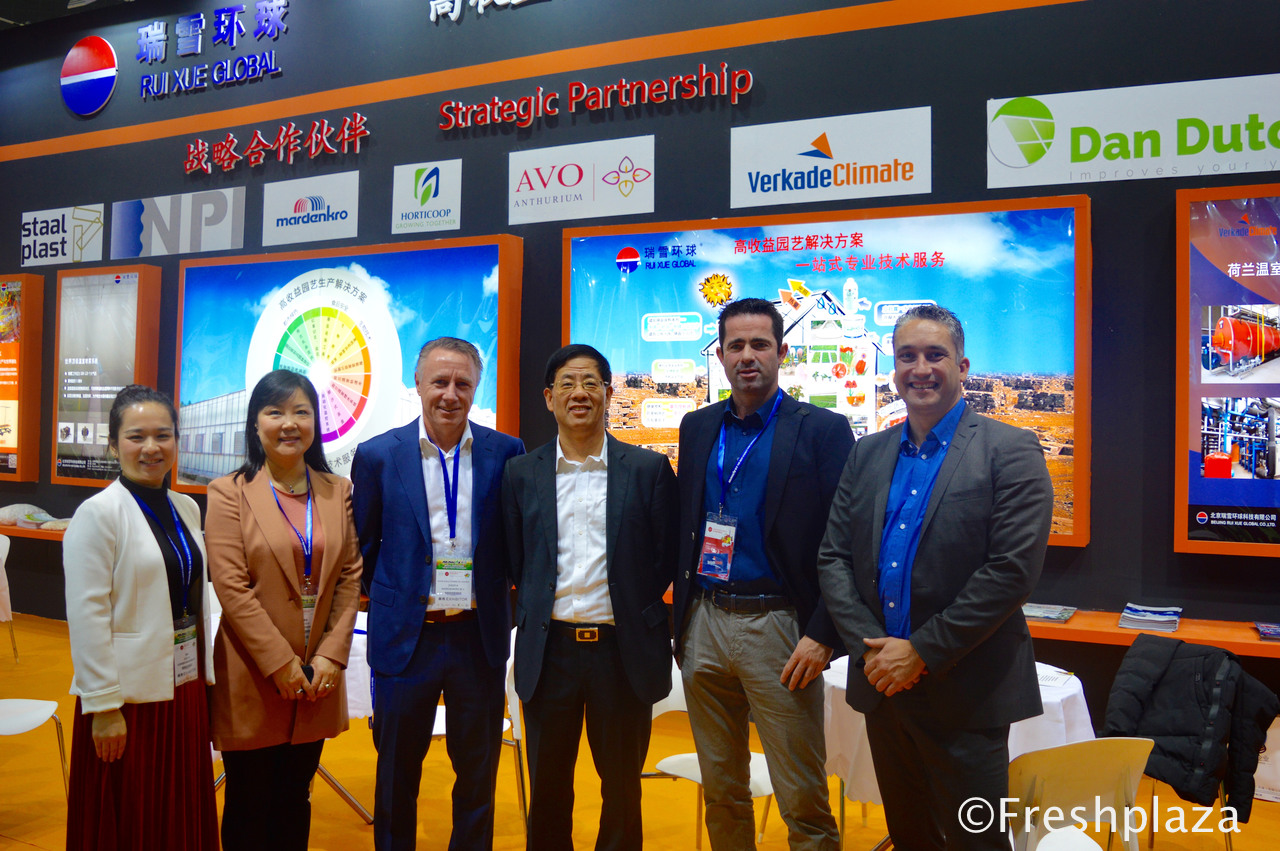 (left to right) Journey Chow and Xue Ping Qu from Beijing Ruixue Global Co., Ltd, Roger de Jagher from Mardenkro, Rui Qing Huang from Beijing Ruixue Global Co., Ltd., Michel from Verkade Climate and Xander van der Zande from DanDutch. All these companies are working together, bundling their knowledge to deliver the best greenhouse projects. (从左到右)来自北京瑞雪环球科技有限公司的周妮、屈雪萍,来自Mardenkro的Roger de Jagher,来自北京瑞雪环球科技有限公司的黄瑞清,来自Verkade Climate的米歇尔,以及来自丹荷的Xander van der Zande。所有这些公司都在共同努力,把他们的知识捆绑在一起,以便提供最好的温室项目。