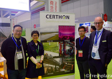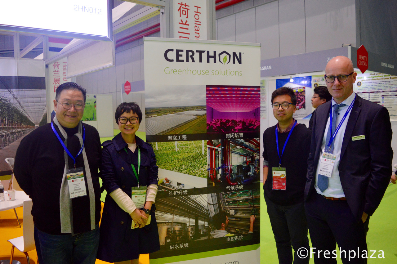 From left to right, Simon Lin, Wang Wenjing, Wang Chengda and Richard van der Sande from Certhon. Certhon designs and builds modern greenhouses for the greenhouse horticulture sector and is an innovator in the development of growth chambers and technical systems. 从左到右为来自Certhon的沈滟、王雯静、王成达和Richard van der Sande。Certhon专为温室园艺行业设计并建造现代温室,是生长室和科技系统开发的创新者。