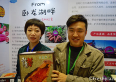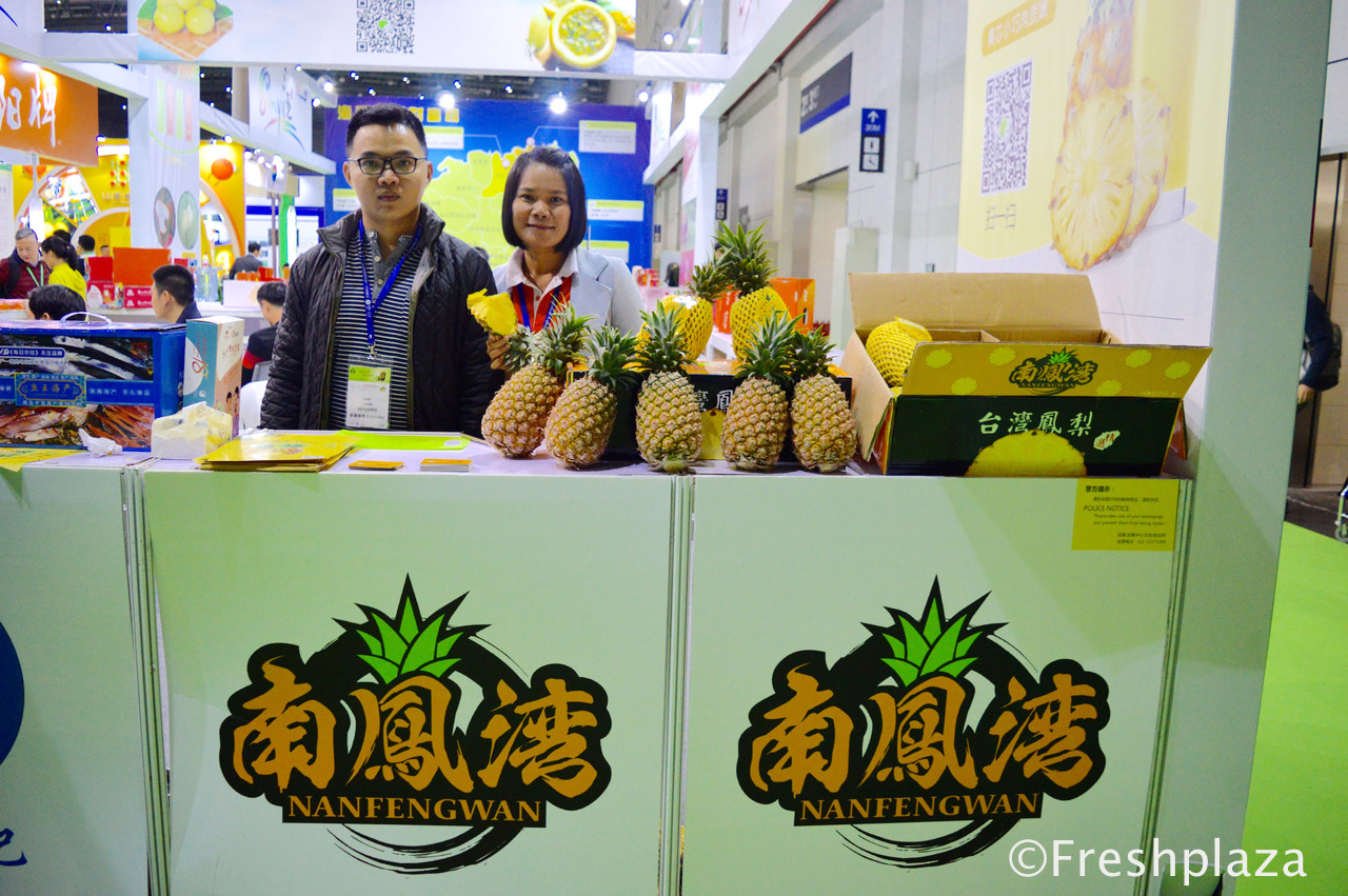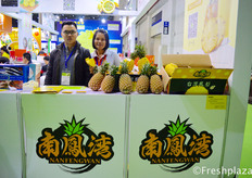 Zhou Zhiqiang and Zhou Caina from Nanfengwan. Presenting their pineapples from Taiwan. 来自海南天地源农业发展有限公司的周志强和周才娜,他们在展示来自台湾的菠萝。