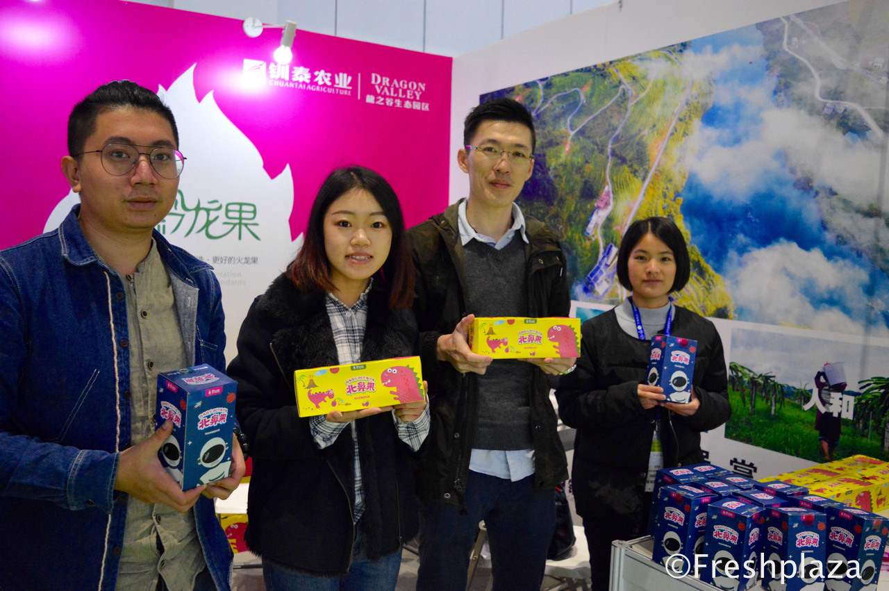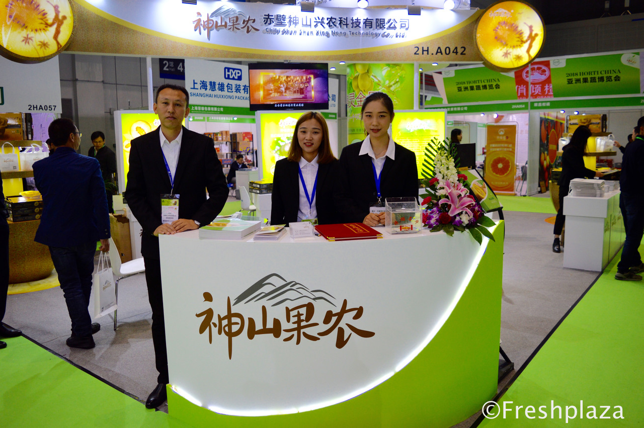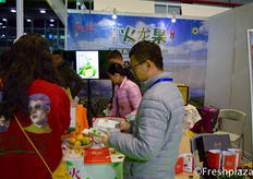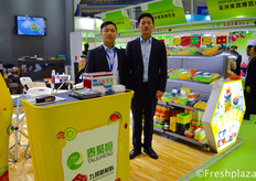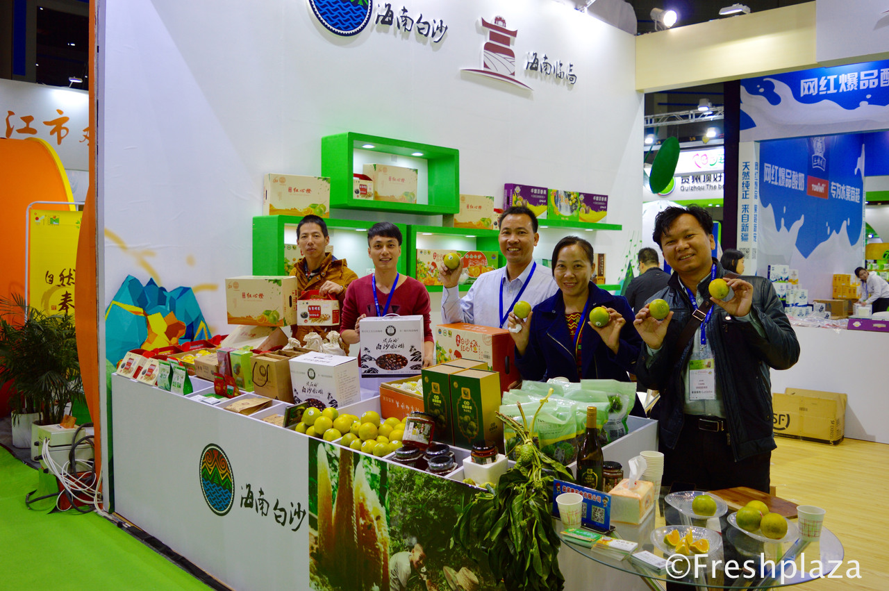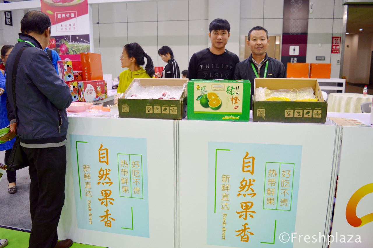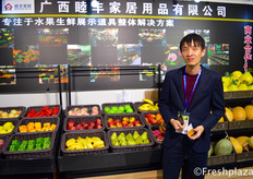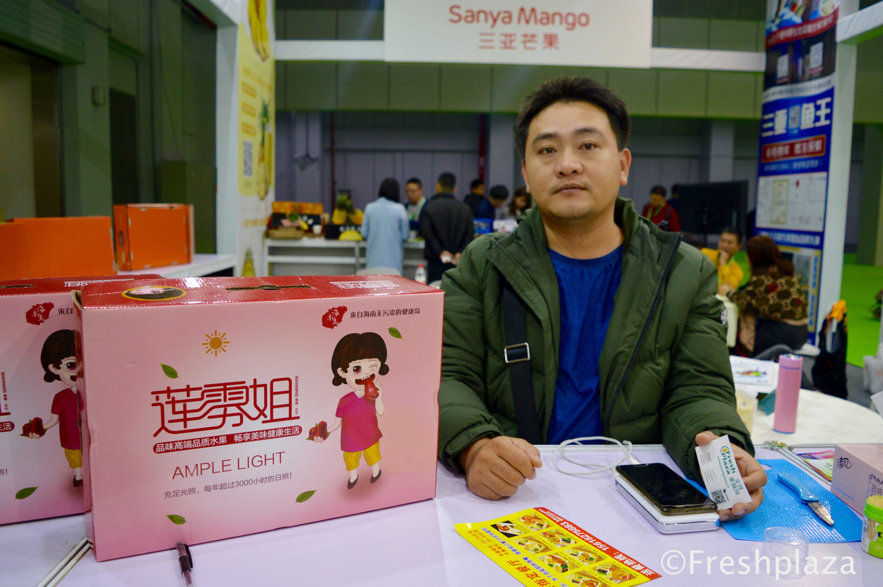 Mr. Chang Zhongjie and Mr. Su from Hainan Natural fruit scent Agricultural Development Co., Ltd. They are specialised in selling tropical fruits from Hainan. 海南自然果香农业开发有限公司的常中杰先生和小苏,该公司专门销售来自海南的热带水果。