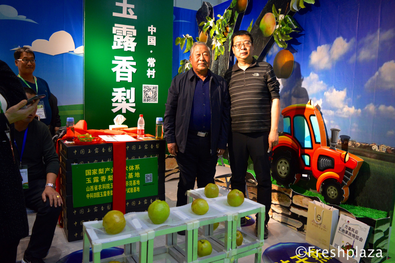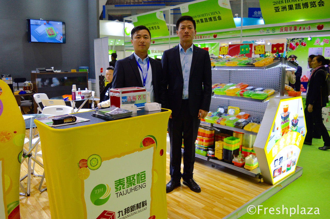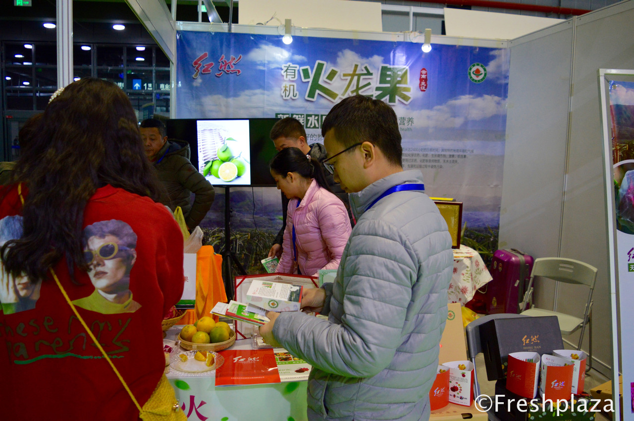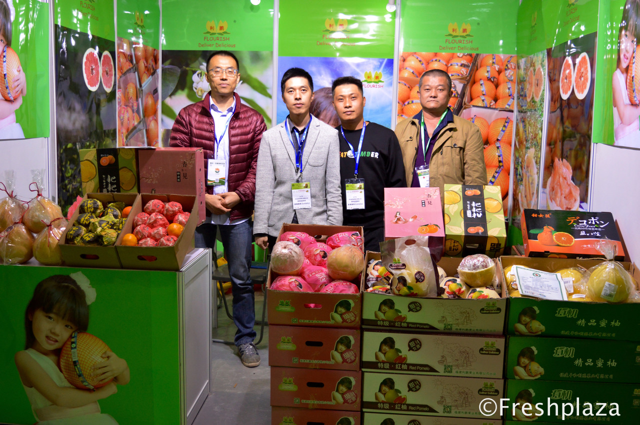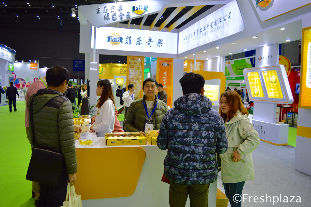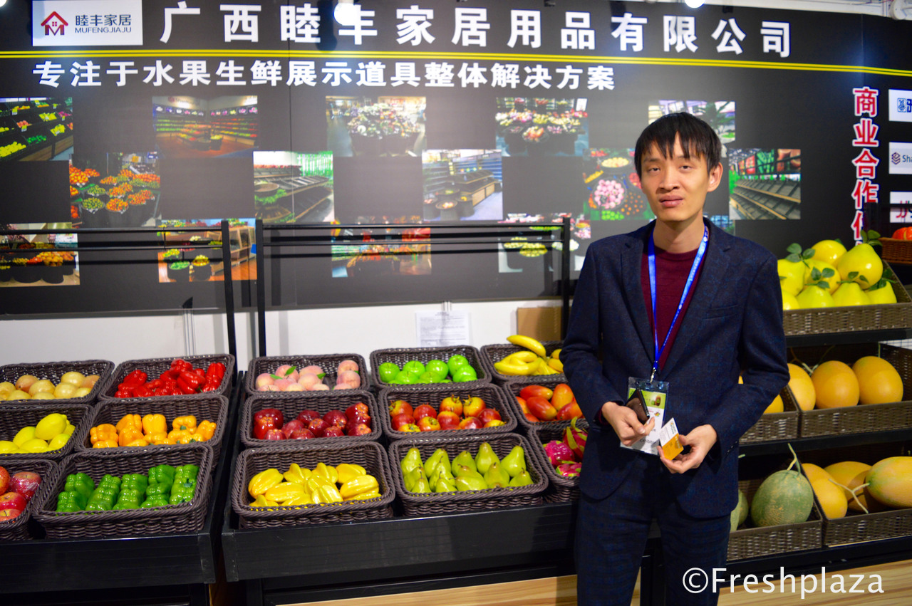Mr. Chang Zhongjie and Mr. Su from Hainan Natural fruit scent Agricultural Development Co., Ltd. They are specialised in selling tropical fruits from Hainan. 海南自然果香农业开发有限公司的常中杰先生和小苏,该公司专门销售来自海南的热带水果。