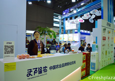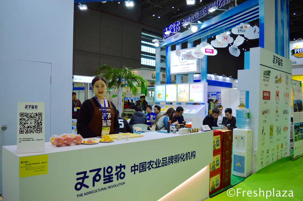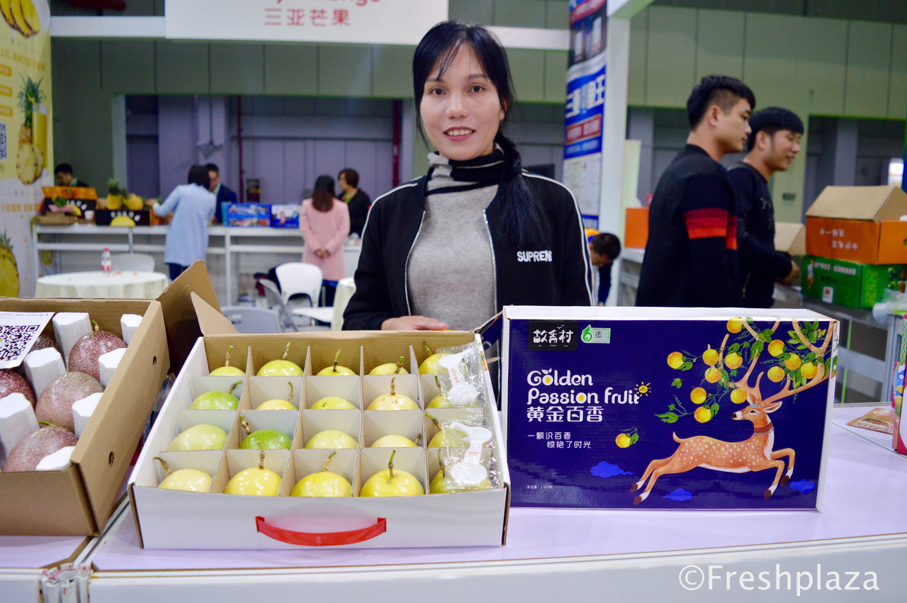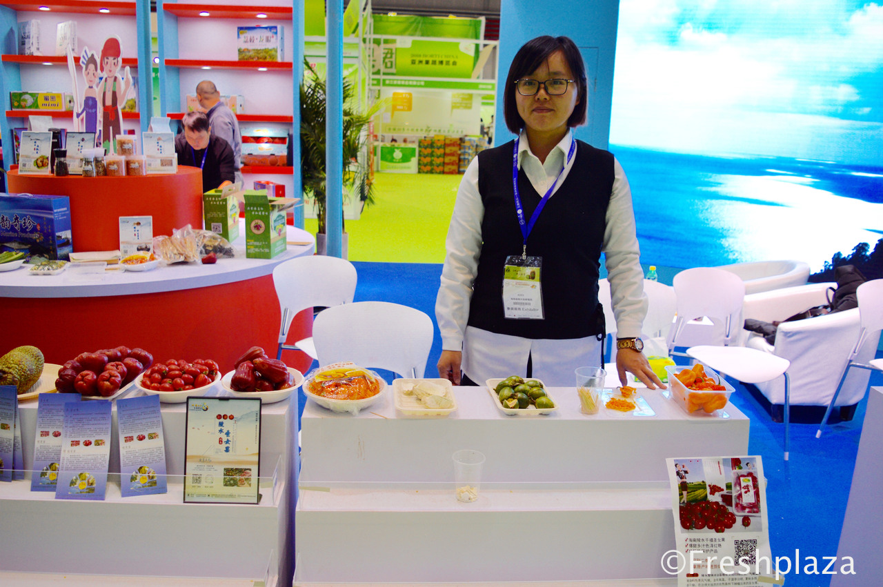 Yanzi with the products from Hainan Didi WowoJia Ecological Agriculture. 来自海南滴滴沃家生态农业的燕子携该公司产品参展