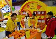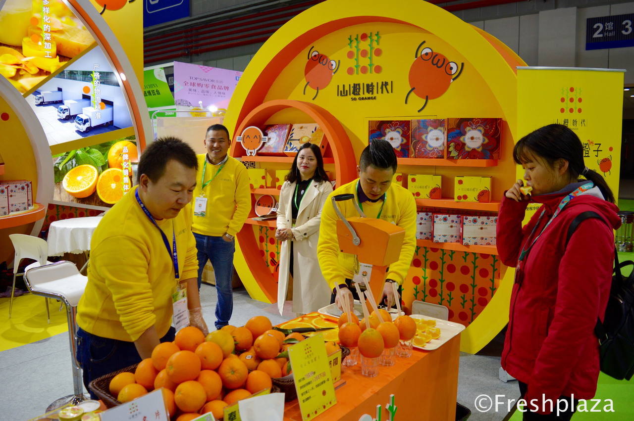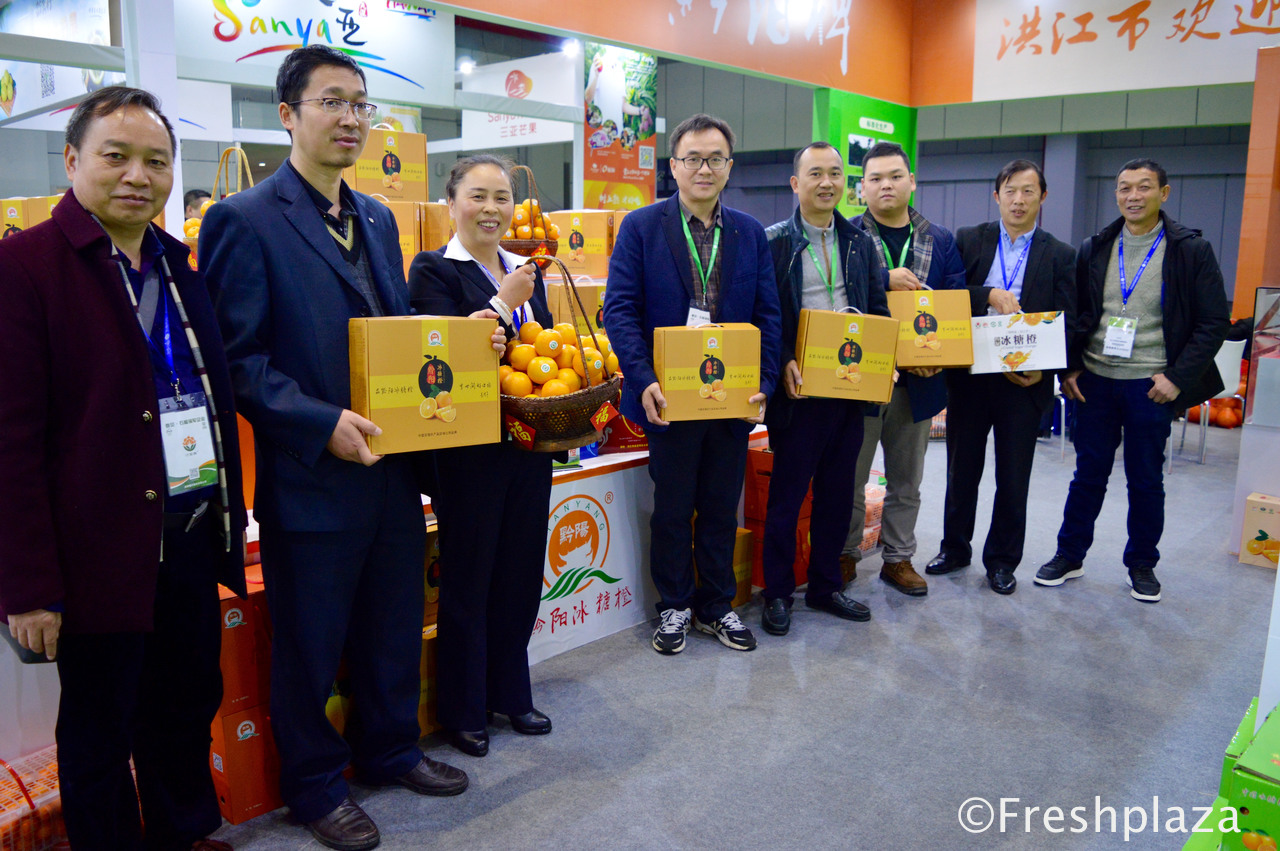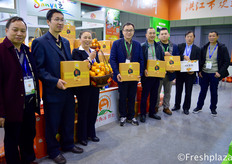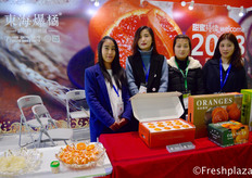 Johnny Xiong (right) with his team from Chongqing Anyijia Industrial Co., Ltd. preparing oranges to taste. 来自重庆安益佳实业股份有限公司的熊章林(右边)与他的团队正在为到来的访客准备试吃的橙子。