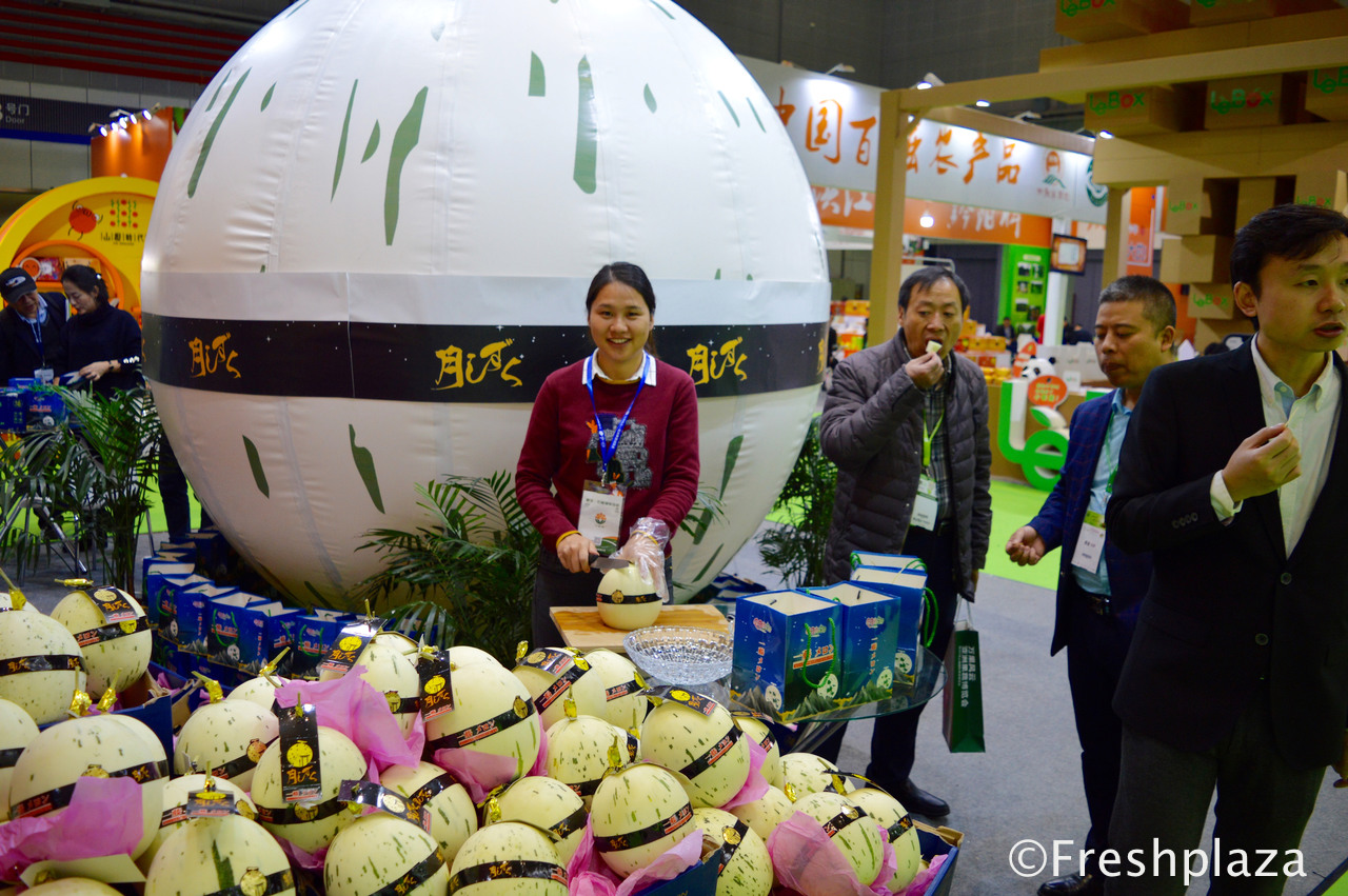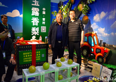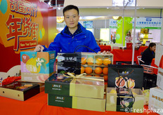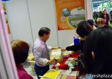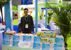 Mr. Qiu Baodong from Jing Peng, presenting their Honey Dew melons. 来自景鹏的邱宝东先生正在展示他们的蜜瓜。