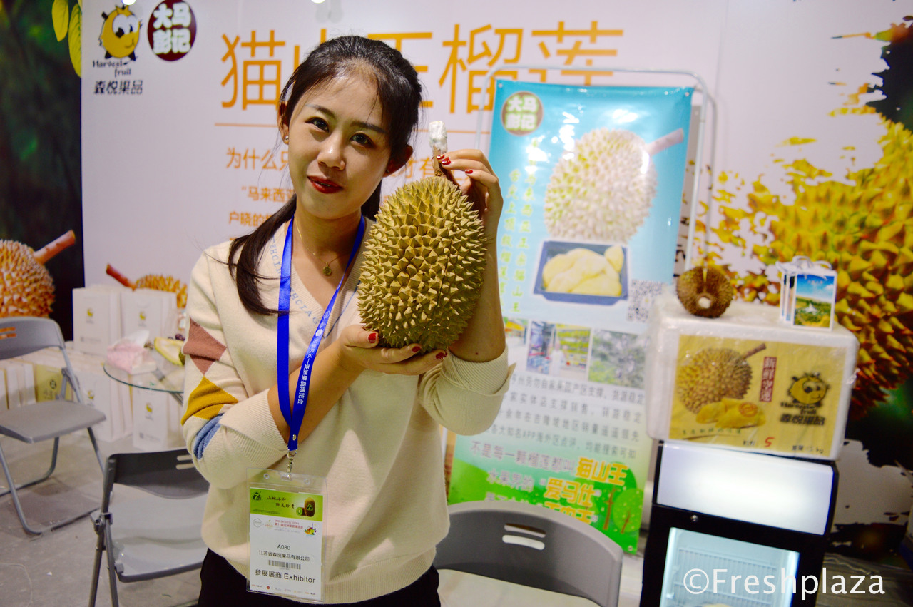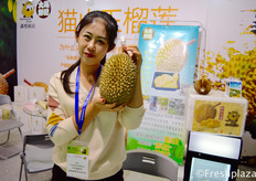 Jiangsu Sheng Senyue Guopin Limited, presenting their fresh durian. 江苏省森悦果品有限公司正在展示他们的新鲜榴莲