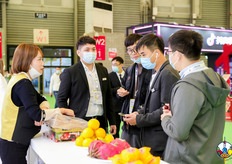 全球鲜果品牌运营商的展位,公司代表为展会观众介绍宝露橙等果品。
