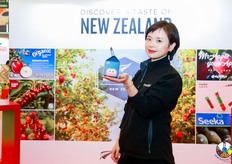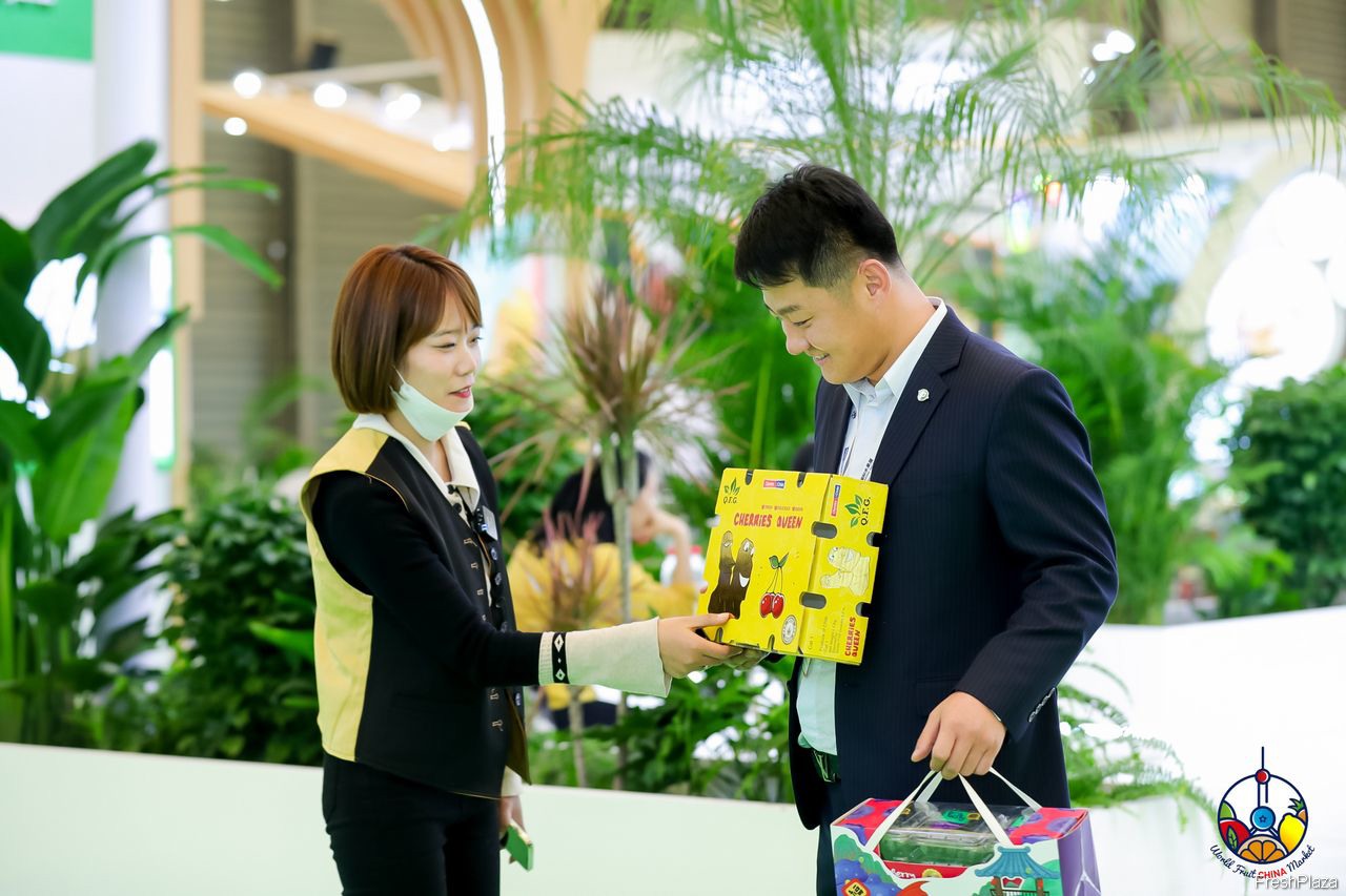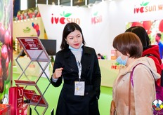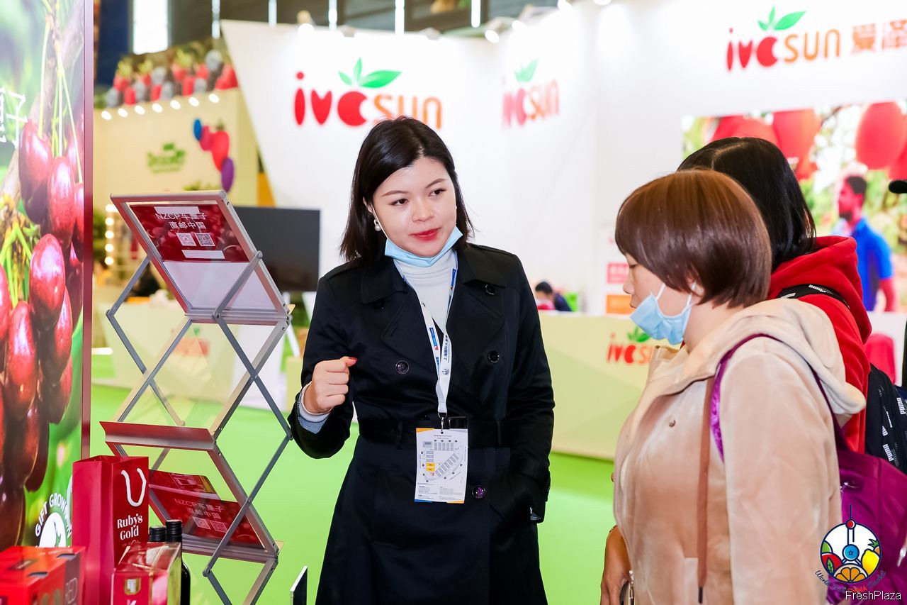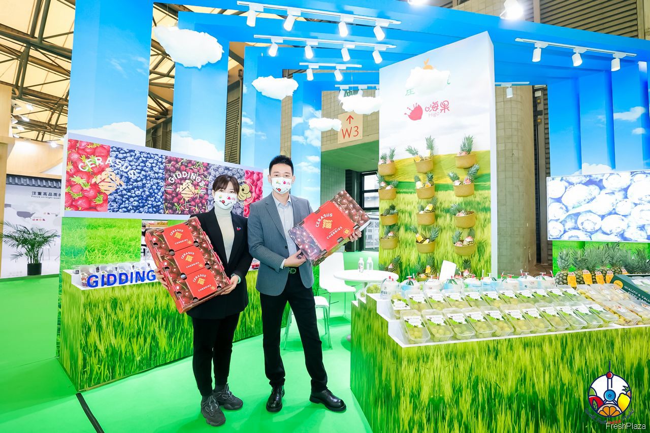 嗨果公司带来了多种水果。参展代表正在展示Cerasus车厘子产品。
