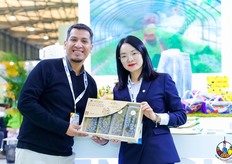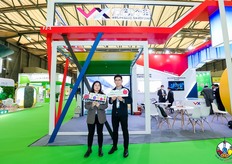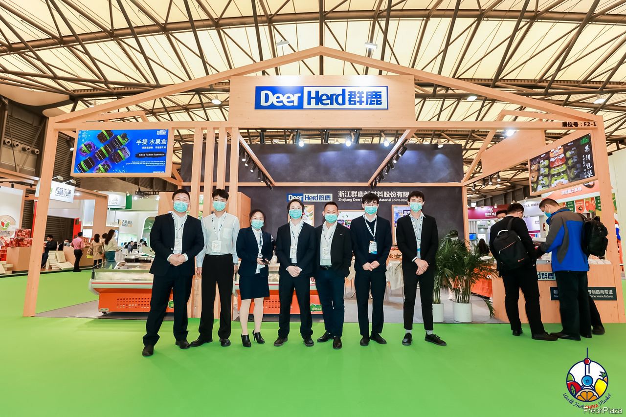 浙江群鹿新材料股份有限公司的代表在展位前合影留念。公司带来了特色手提水果盒参展。