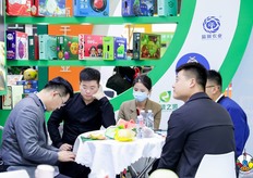 参展观众在果之友公司的会客区进行交流。