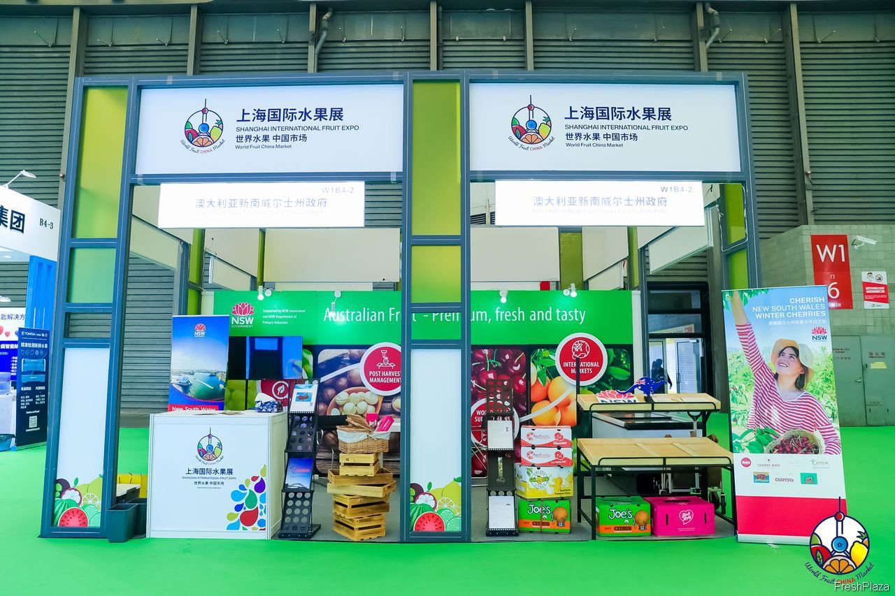 澳大利亚新南威尔士州政府的展台中摆放着多种类的澳洲进口水果。