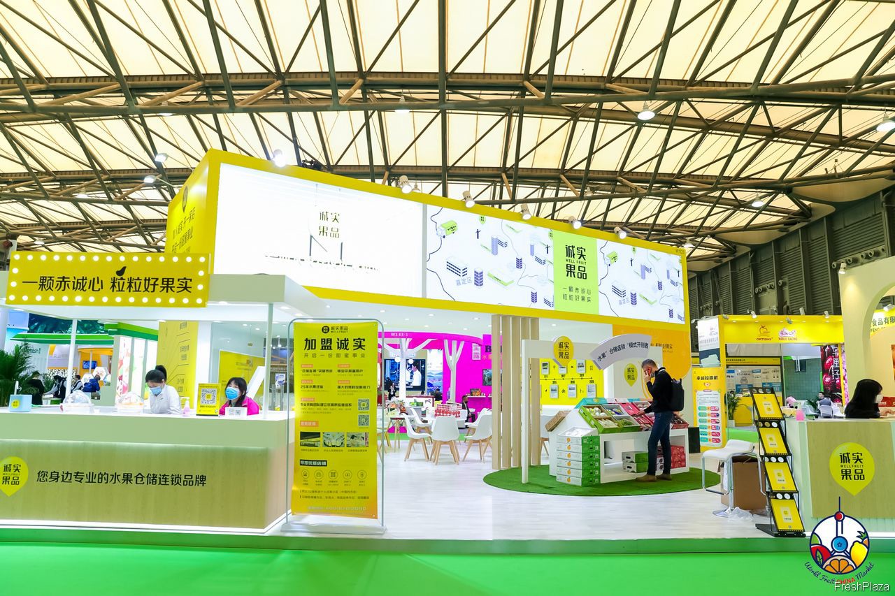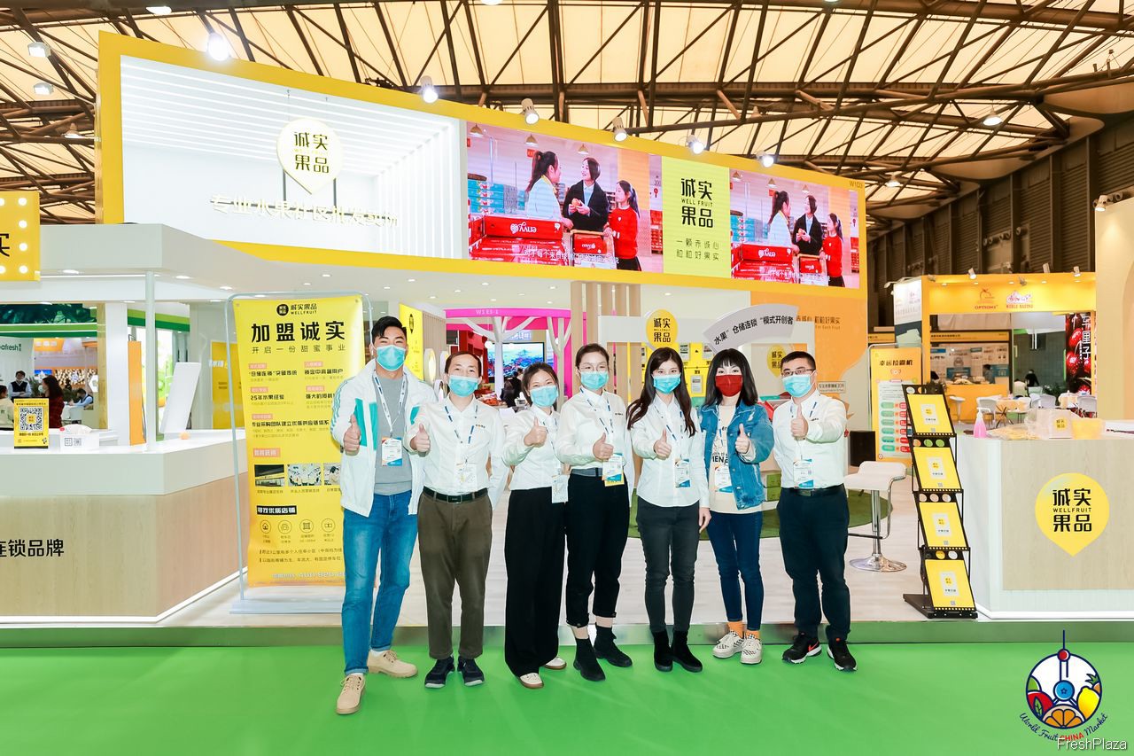诚实果品的代表在展台前合影留念。公司被誉为“水果仓储连锁模式的开创者”。