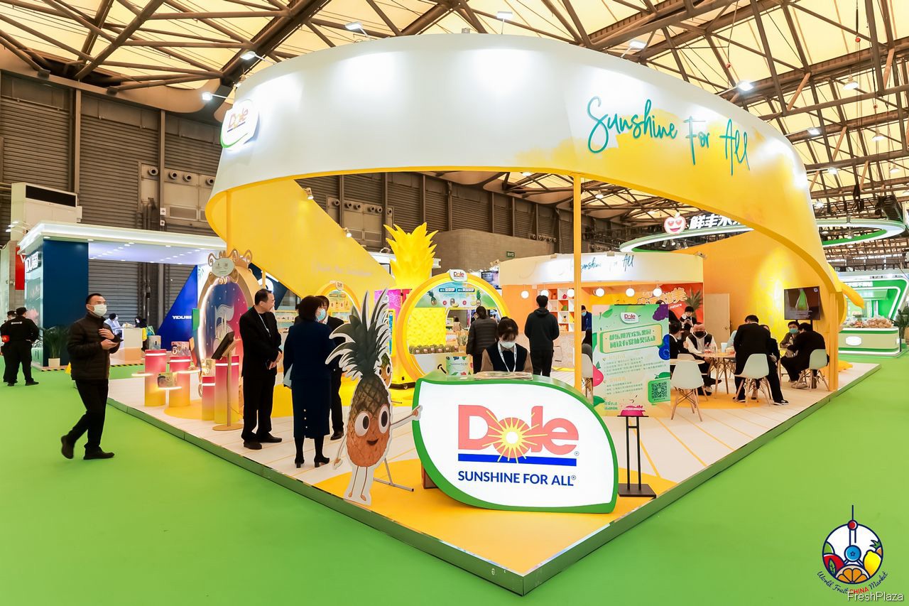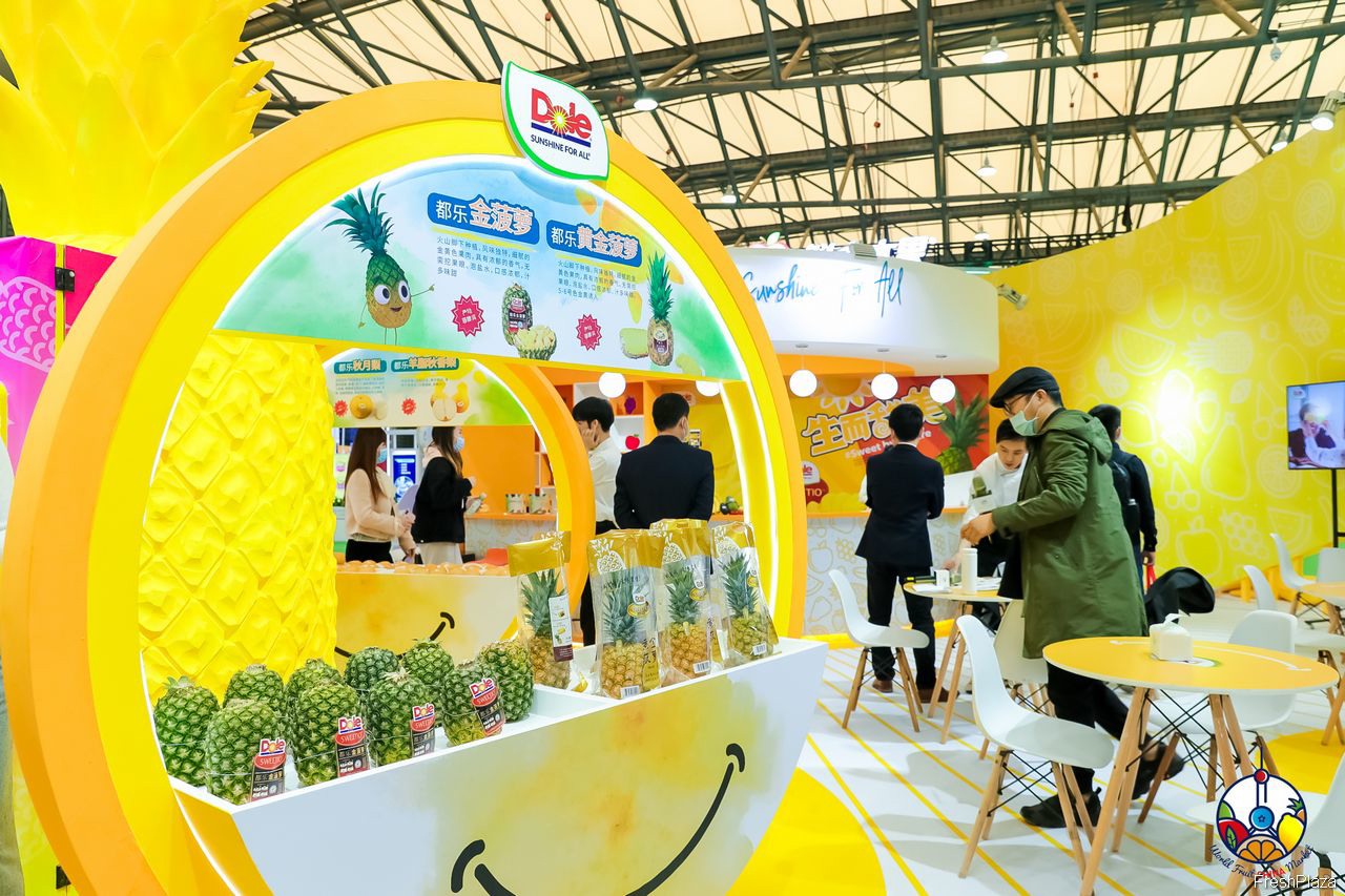 都乐展台上摆放着多种新鲜水果做展示。