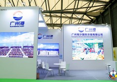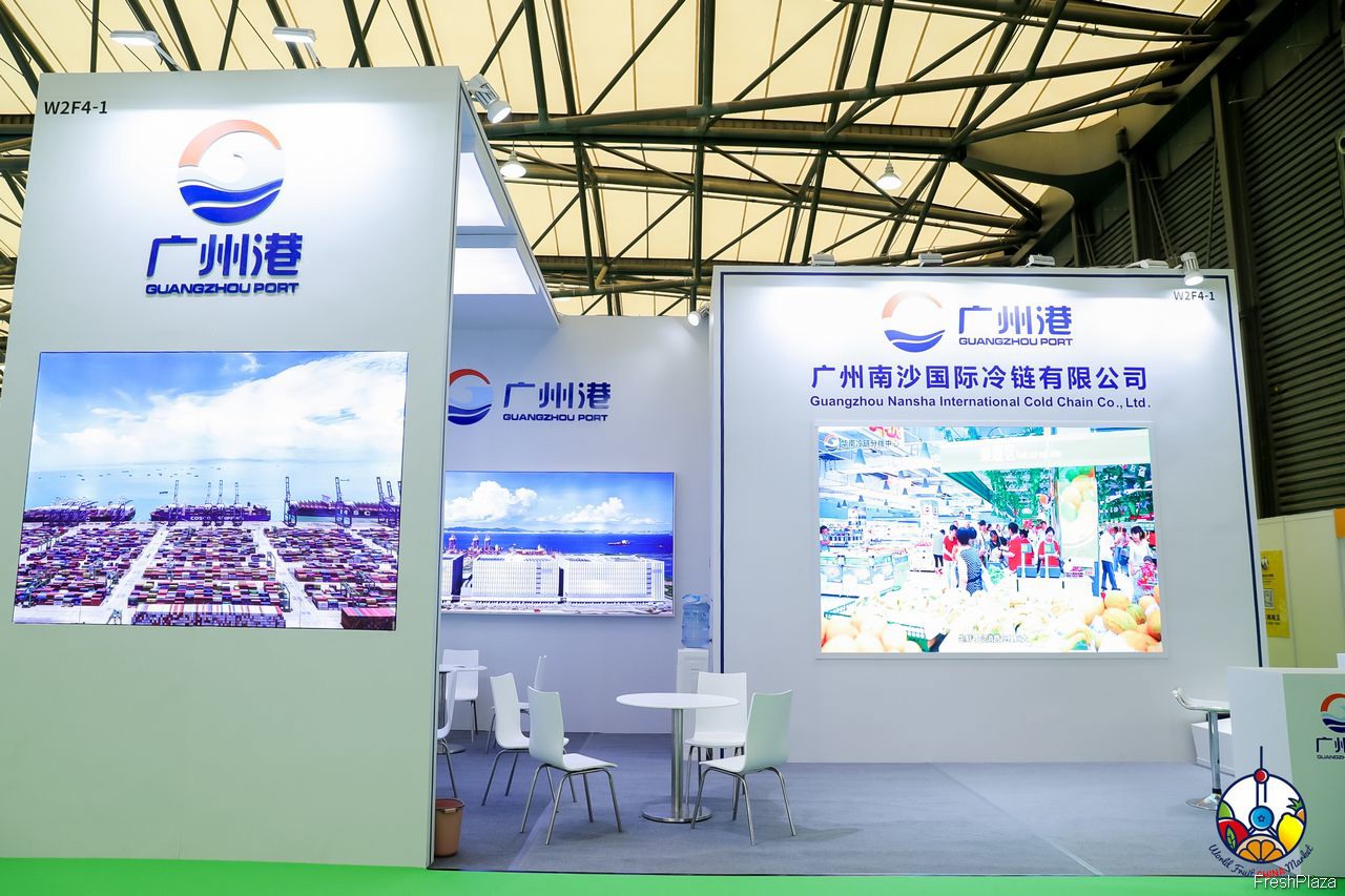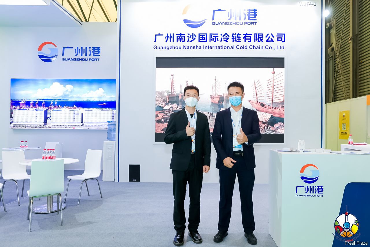 广州南沙国际冷链有限公司的参展代表在展台前合影留念。