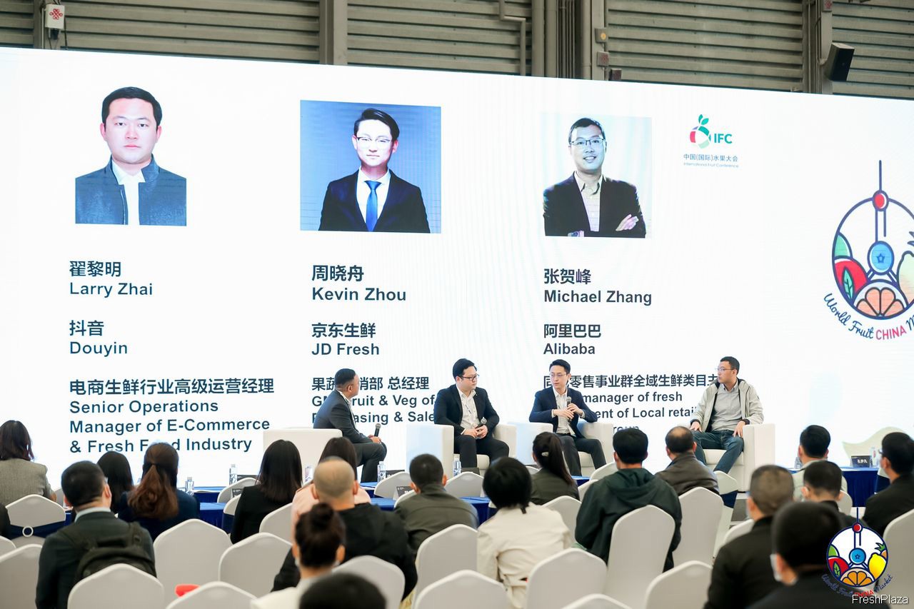 中国国际水果大会上,来自抖音、京东生鲜和阿里巴巴的代表进行演讲和交流。