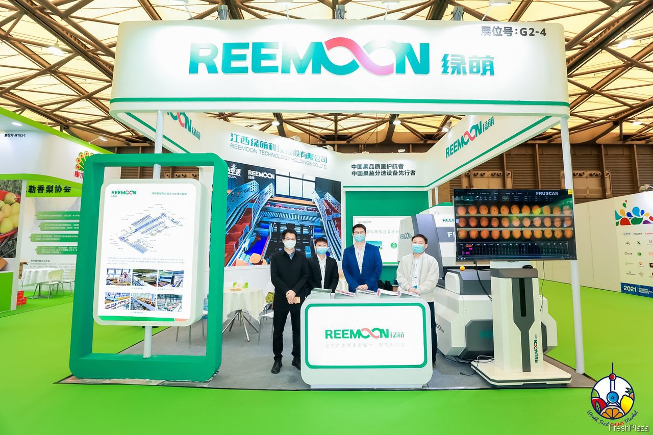 果蔬分选设备专业研发生产商绿萌科技股份有限公司的代表在展台前合影留念。