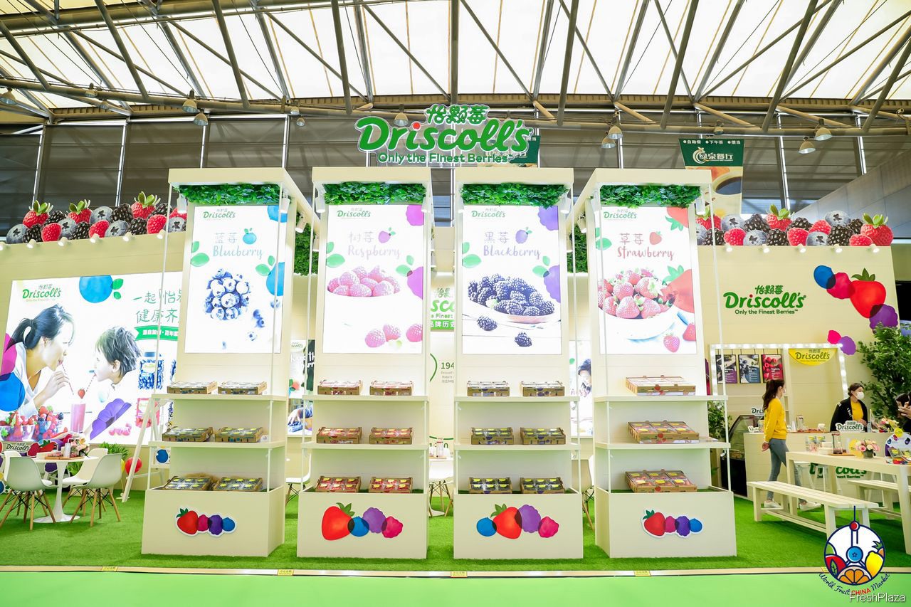 怡颗莓的展台上摆放着多种多样的水果。