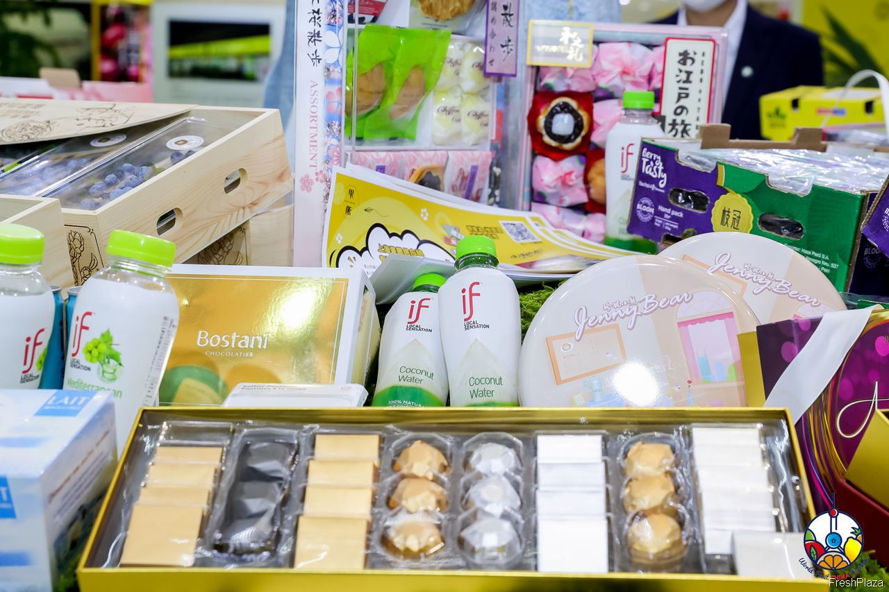 祥果公司的展台上摆放着多个品牌的车厘子产品。