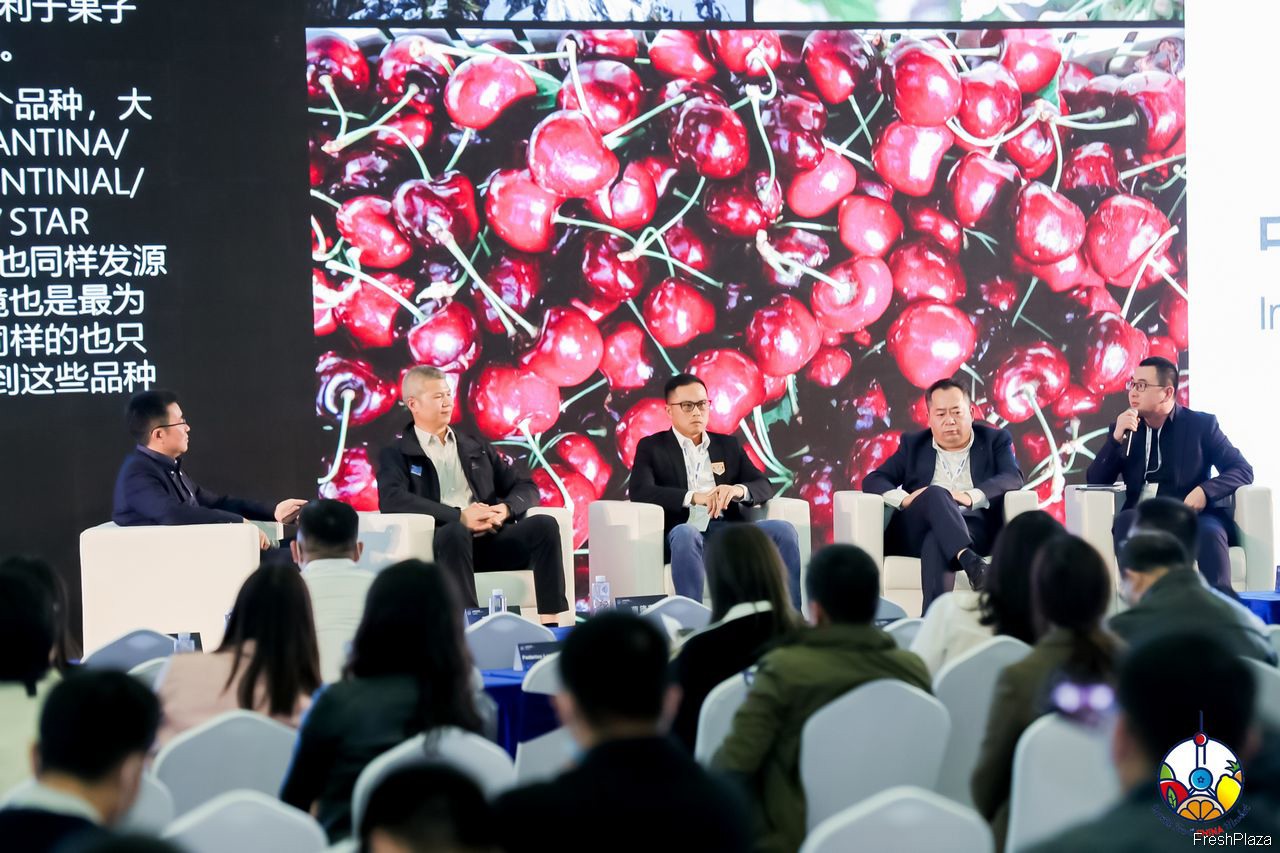 中国国际水果大会上,与会嘉宾正在对比加州车厘子与国产车厘子在生产方面的差异。