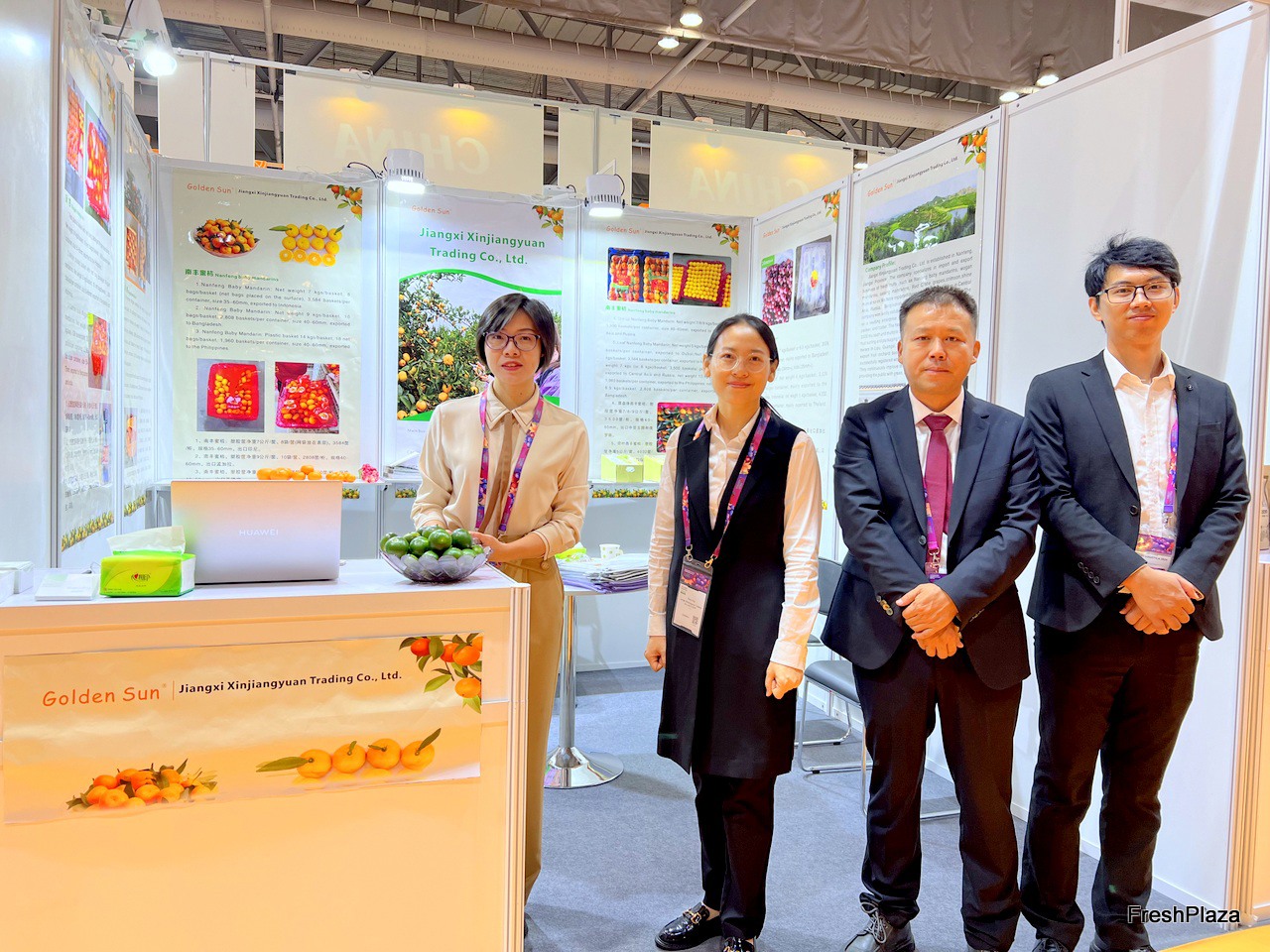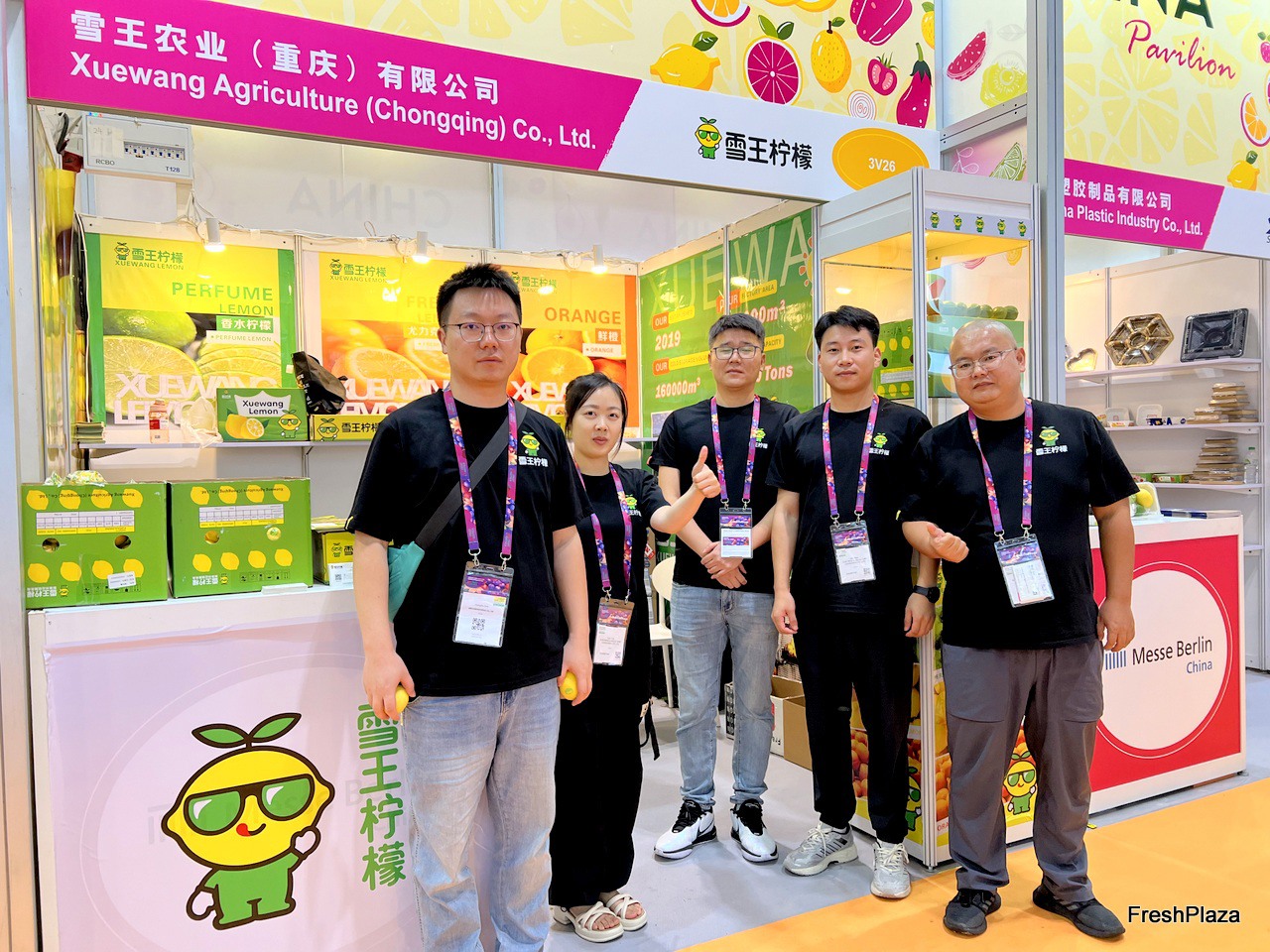 Mr Ma Jie (first right) with his team. This is the company's first time at the show. Xuewang Agriculture specialises in the production and export of lemons. The company has its own factories in two major lemon producing areas in Sichuan An'yuan and Chongqing Tongnan./ Ma Jie 先生(右一)与他的团队。这是该公司首次参加展会。雪王农业专业从事柠檬的生产和出口。公司在四川安源和重庆潼南两大柠檬产区拥有自己的工厂。