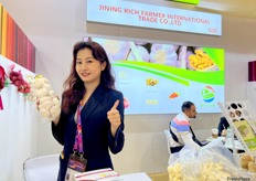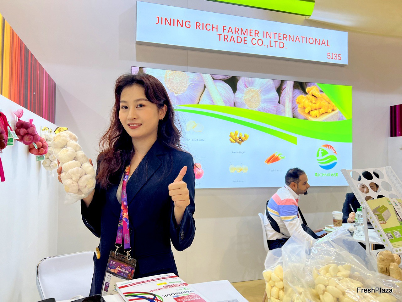 Representative of Jining Rich Farmer. The company exports a variety of raw garlic and processed garlic products. / 济宁沃农国际贸易有限公司的代表。该公司出口各种生大蒜和加工大蒜产品。