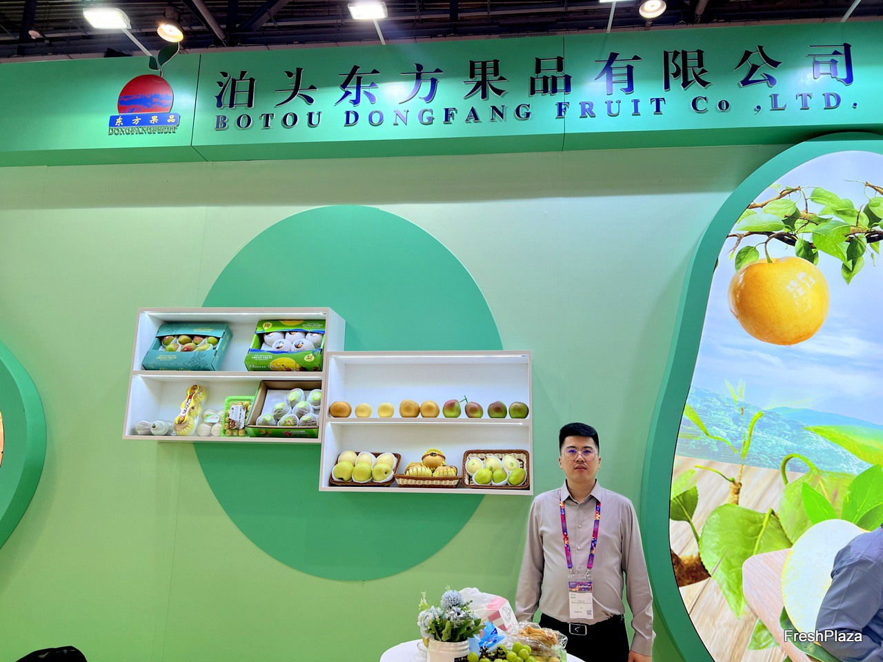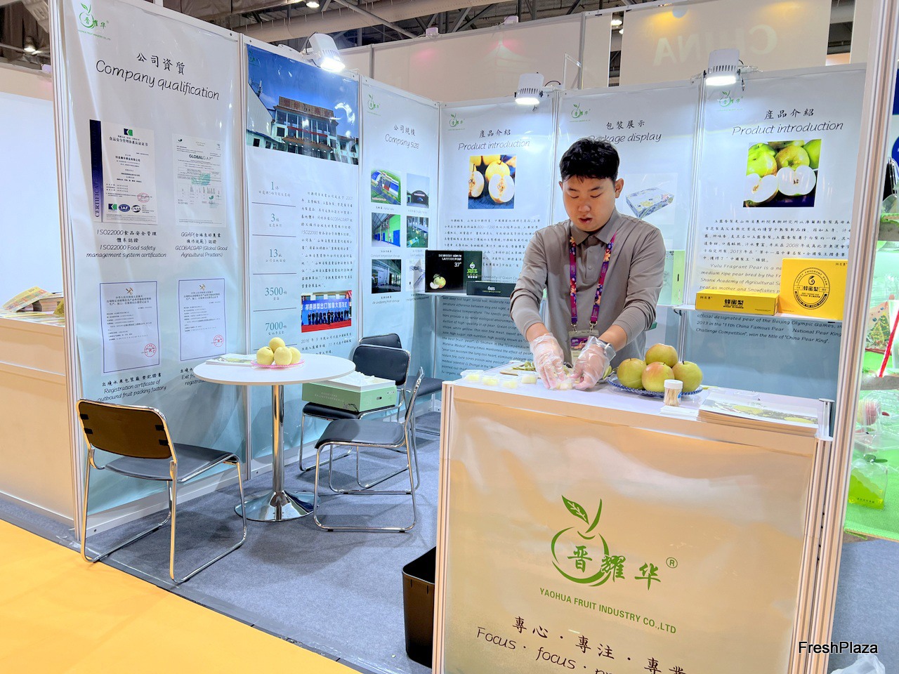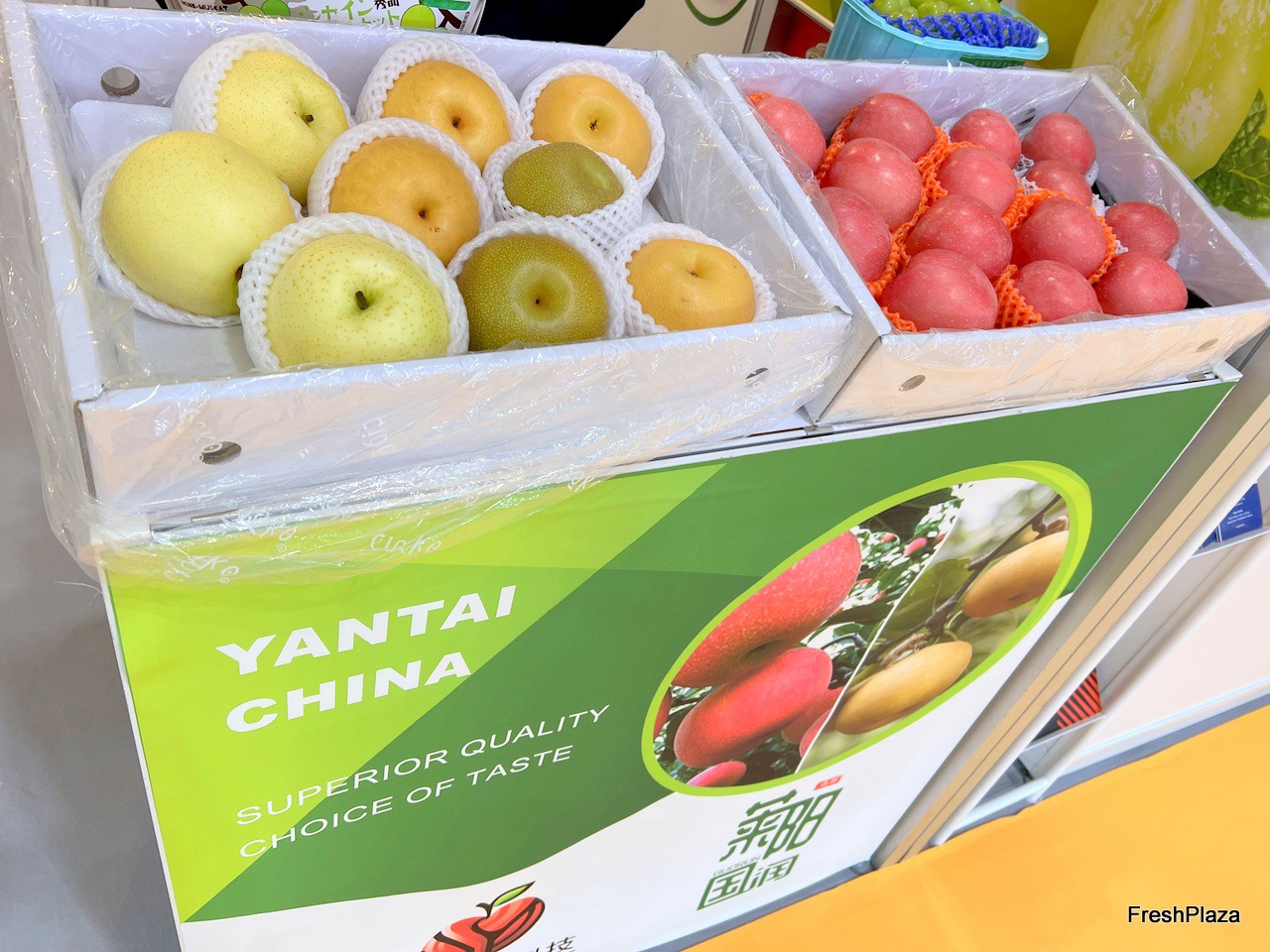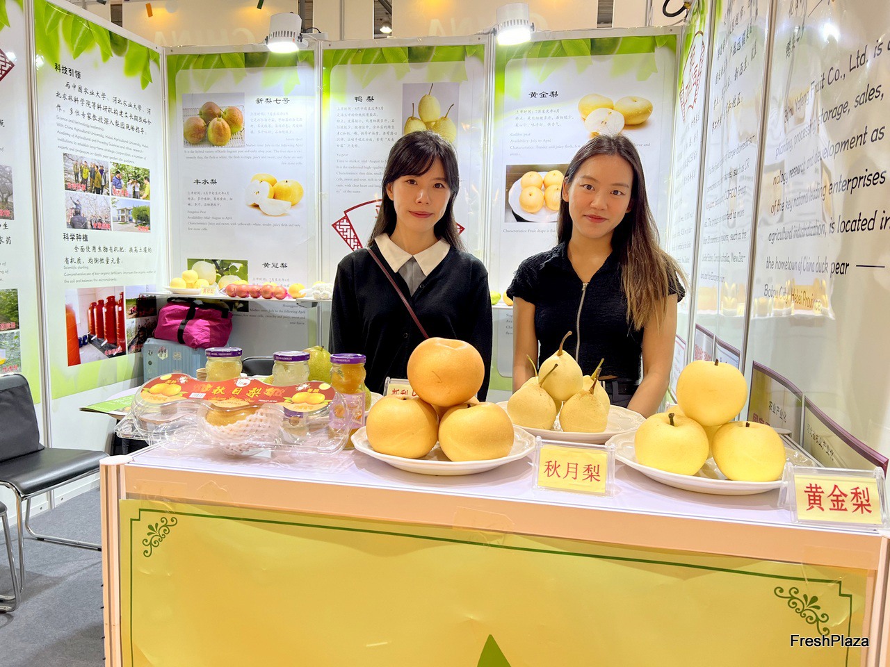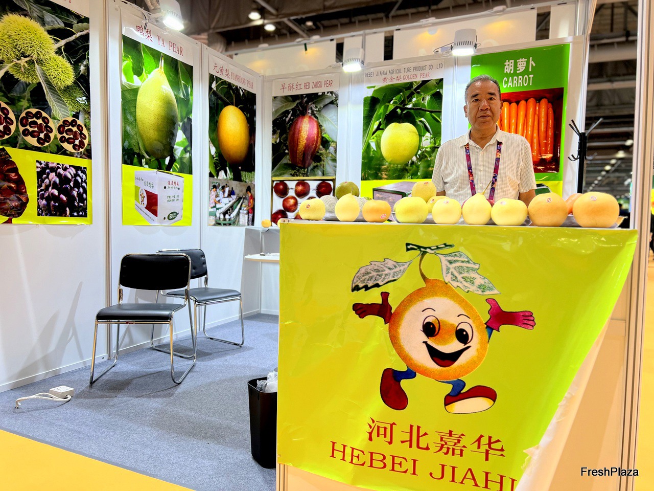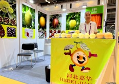 Botou Yafeng, a pear grower and exporter based in Botou City, with their product display on the stand. / 位于泊头市的梨种植商和出口商泊头亚丰在展位上展示他们的产品。