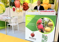 Representatives from Qixia City Jiaoyang Fruit and Vegetables. Apple, pear and grapes are their main export products. / 栖霞市骄阳果蔬公司代表。苹果、梨和葡萄是他们的主要出口产品。