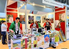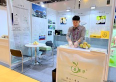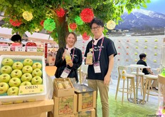Mrs Machinohe (left) and Mr Tandai (right) of Aomori Premium from Japan. The company grows and exports fresh apple and juices. With beautiful stand design and product display, their stand received many visitors. / 来自日本的 Aomori Premium 的 Machinohe 女士(左)和 Tandai 先生(右)。该公司种植并出口新鲜苹果和果汁。凭借精美的展位设计和产品展示,他们的展位吸引了众多参观者。