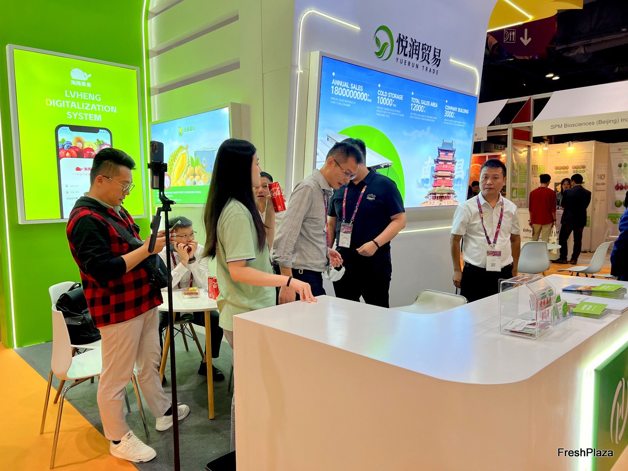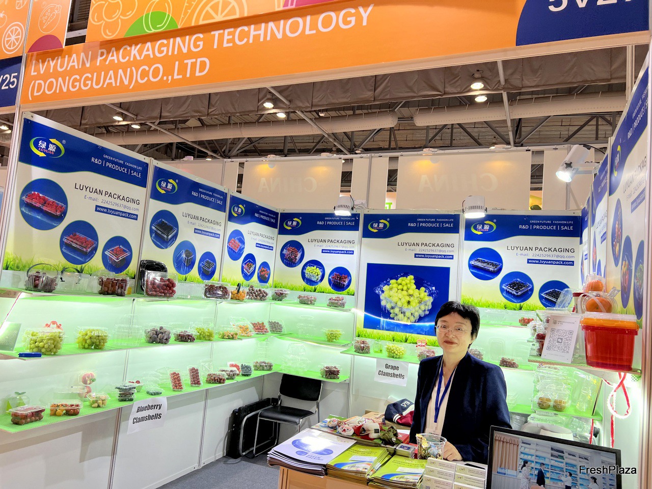 Products display at the Lvye Fruits stand. / 绿叶水果展台上展示的产品