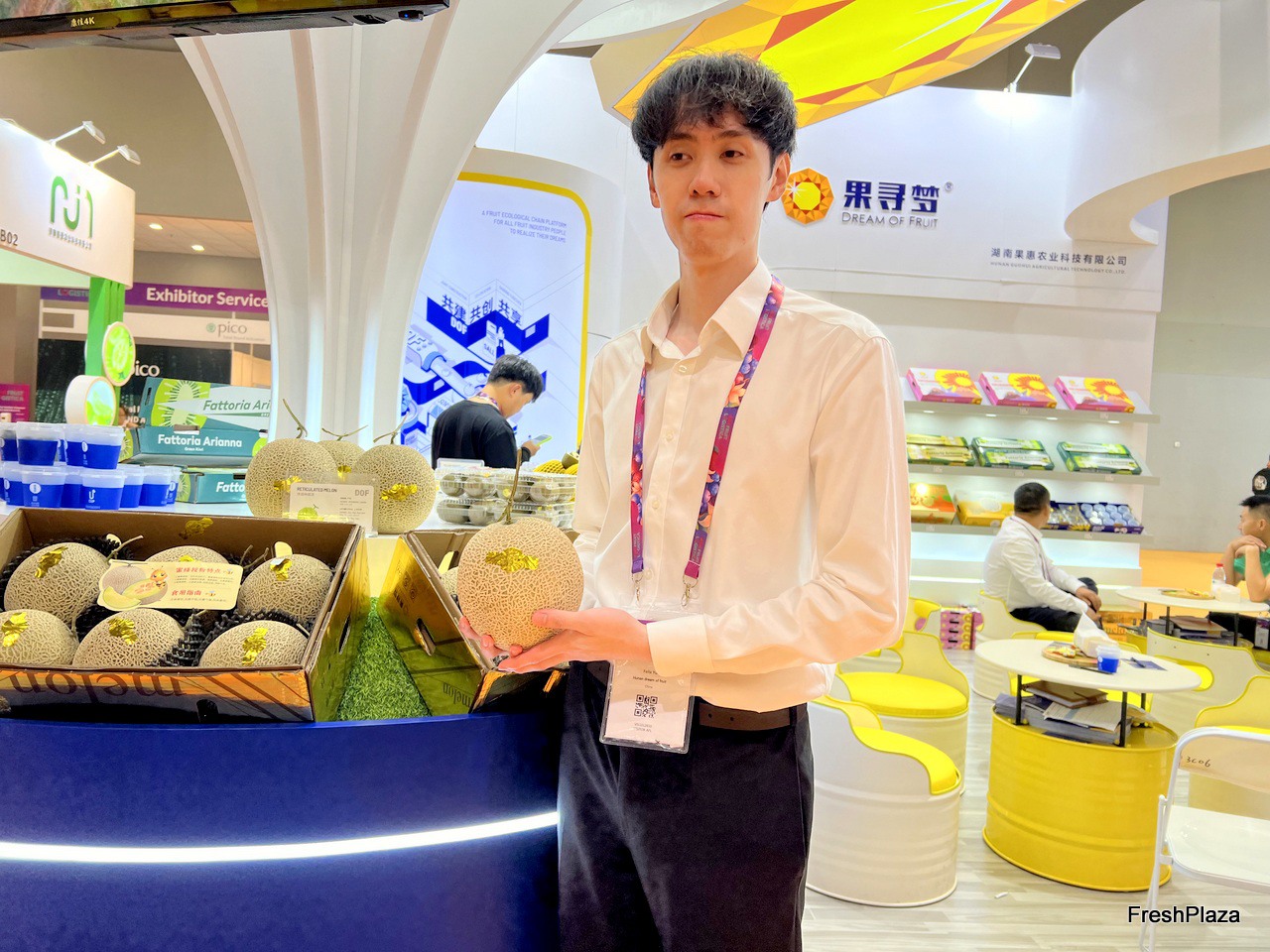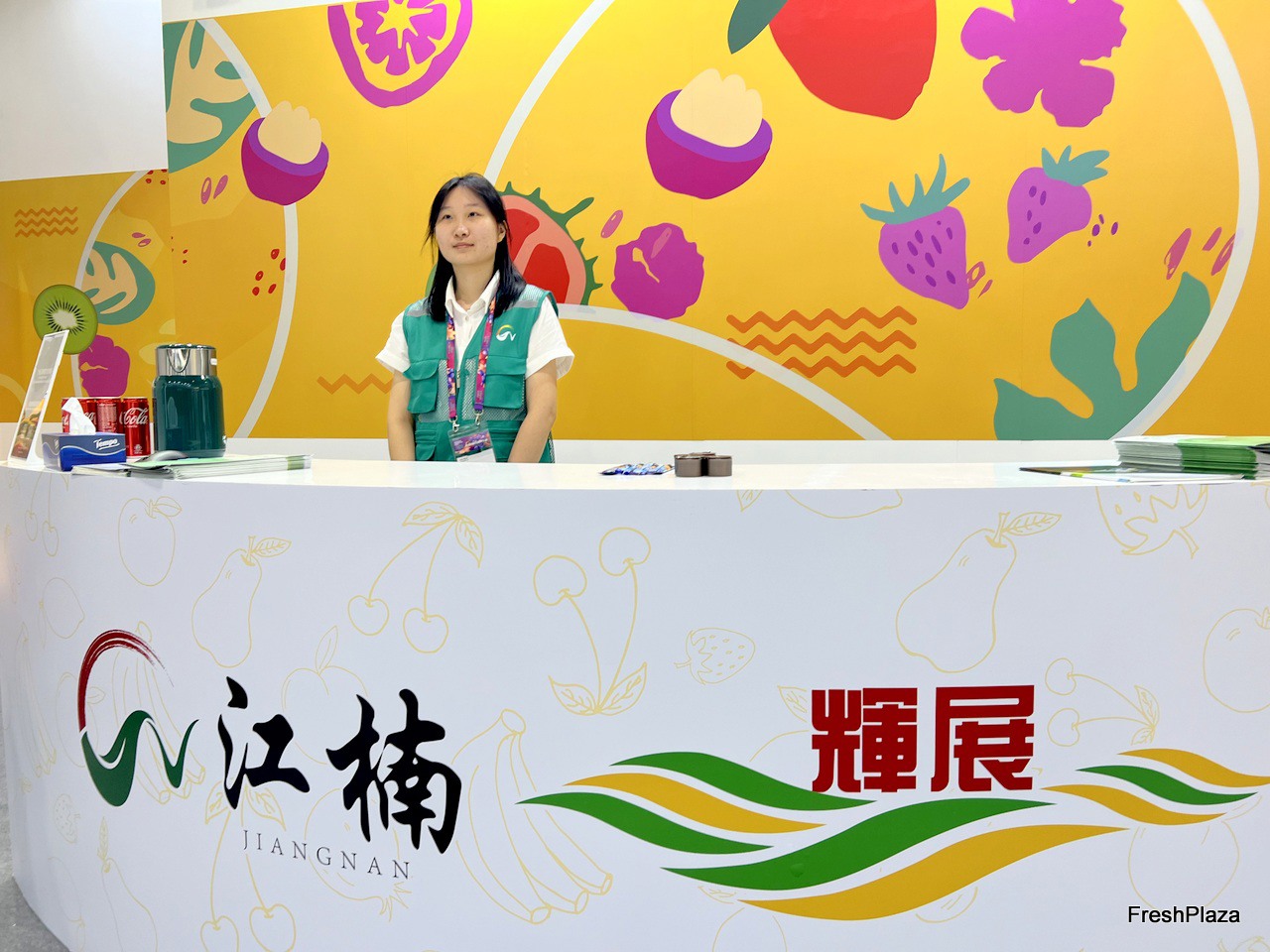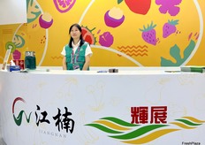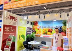 Representative at Xianfeng Fruit stand./ 鲜丰水果的代表在该公司展位前