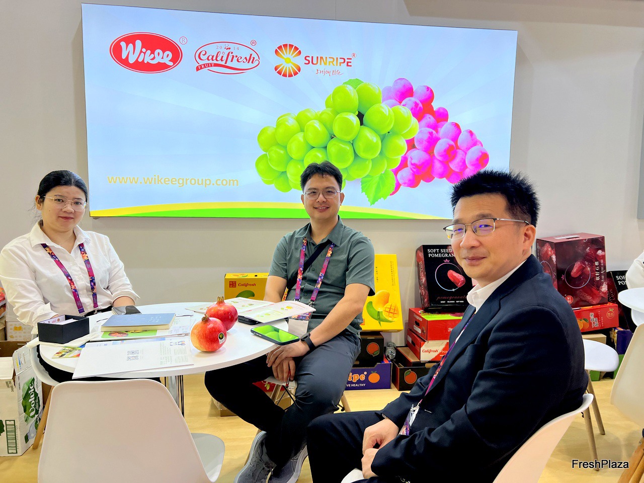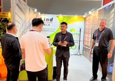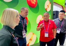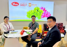 A representative of Lvye Fruit (right) and his clients (first left and second left) from Marroco. / 来自摩洛哥 Lvye Fruit 的代表(右)和他的客户(左一和左二)。
