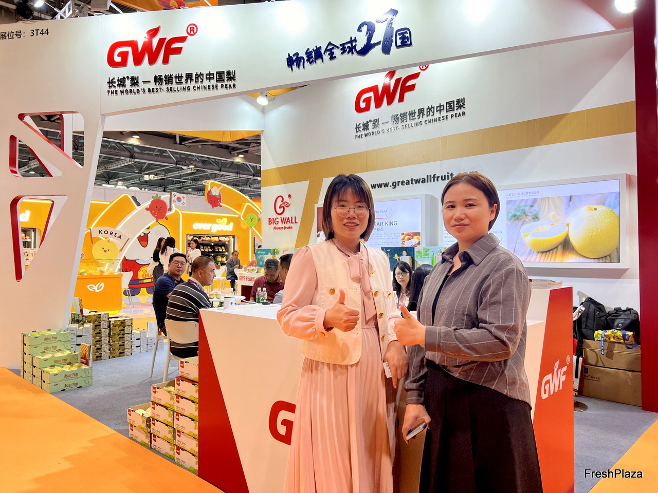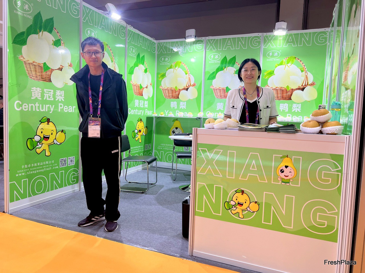 Victor (left) and his colleague of the Xiangnong team on the stand. Based in Xinji, the company grows and exports a wide variety of pears, including the Centruy pear and the Ya pear. Southeast Asia is their main export market. / Victor(左)和他的乡浓团队同事在展台上。该公司总部位于辛集,种植并出口各种梨,包括 Centruy 梨和鸭梨。东南亚是他们的主要出口市场。