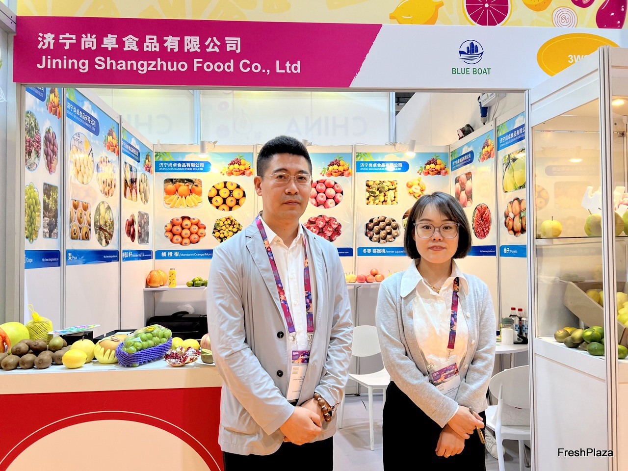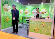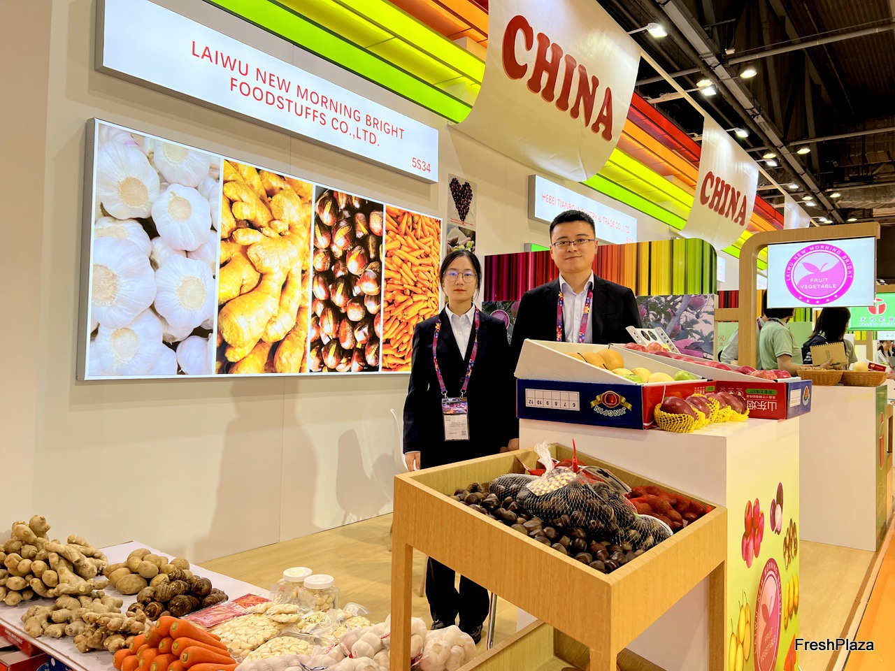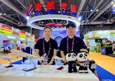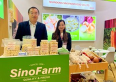 Mr Tian Jie (left) and Mrs An Wang (right) of Jining Shangzhuo Food. The company exports a wide variety of fruits and vegetables, main products in cluding ginger, garlic, kiwi and lemon. / 济宁尚卓食品的 Tian Jie 先生(左)和 An Wang 女士(右)。该公司出口的水果和蔬菜种类繁多,主要产品包括生姜、大蒜、猕猴桃和柠檬。