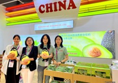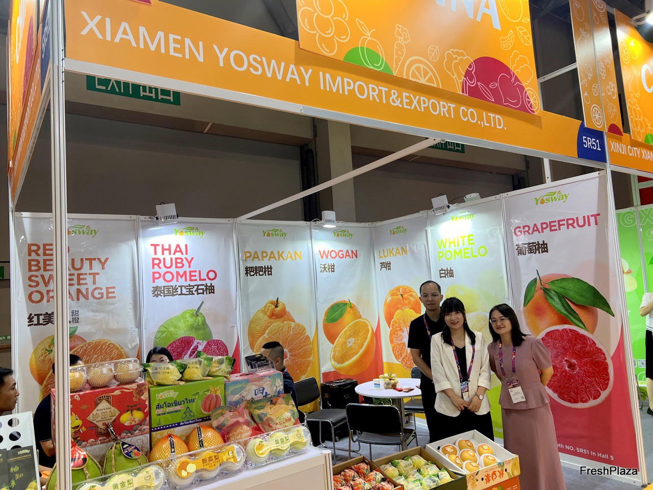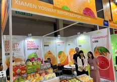 Mrs Liu (first right) and the team of Yosway, a pomelo grower and exporter based in Xiamen, with a product display on the stand. Besides exporting, the company also has a cooperative farm in Thailand and exports a large volume of Thai ruby pomelos to the Chinese market./ 刘女士(右一)与厦门柚子种植及出口商 Yosway 团队在其展位上展示产品。除出口外,该公司还在泰国拥有合作农场,向中国市场出口大量泰国 Ruby 柚。