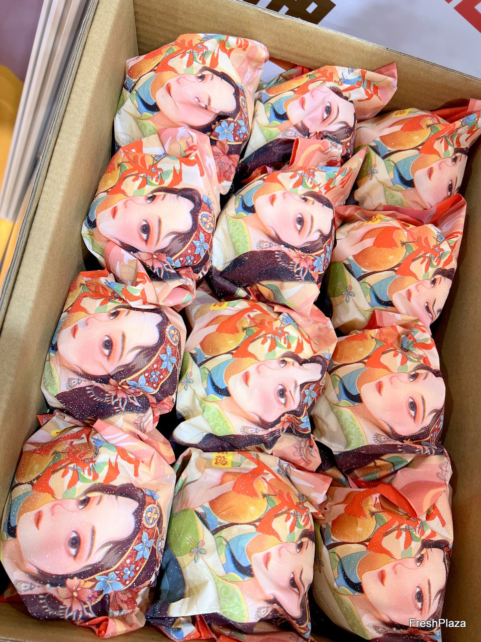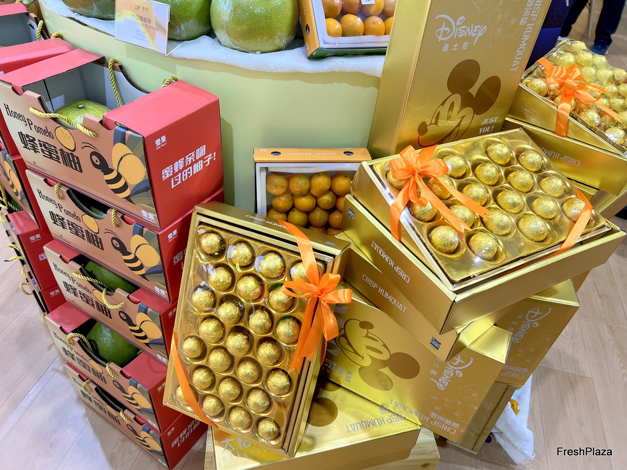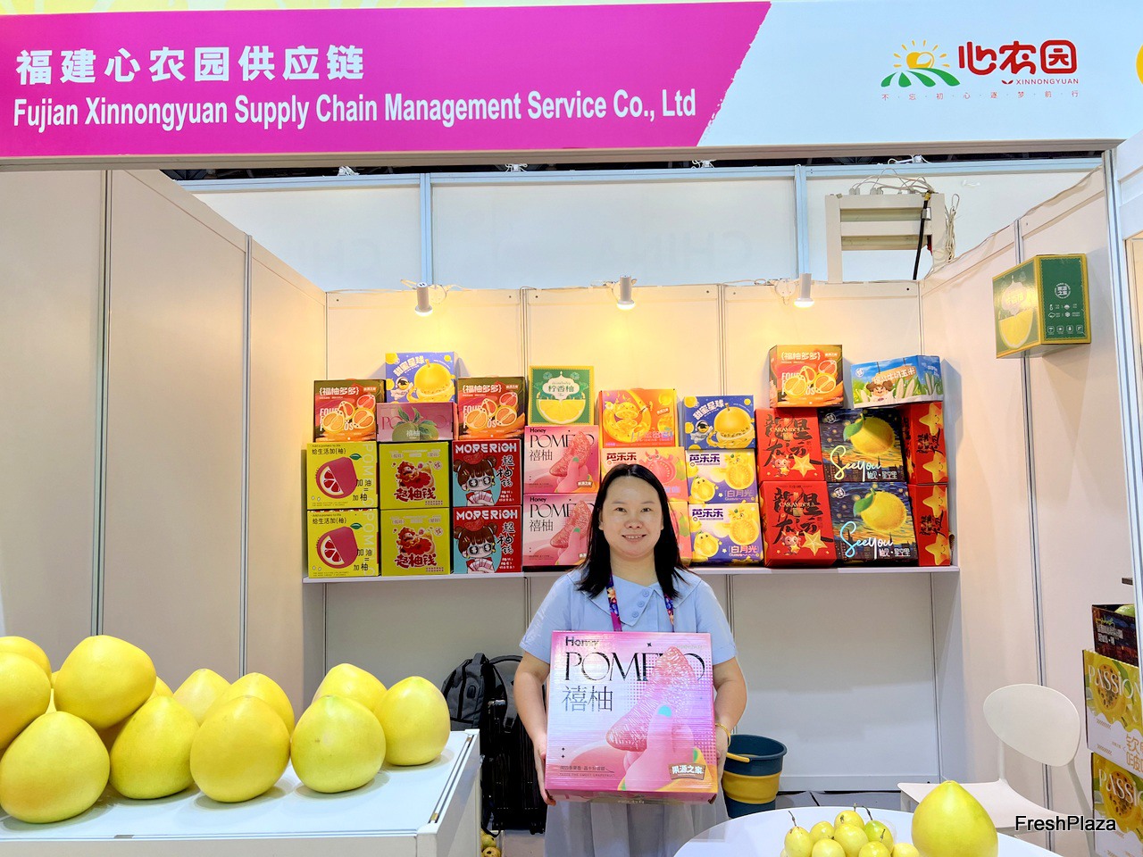 Fujian Xinnongyuan Supply Chain exports a wide variety of pomelos, including red pomelo and honey pomelo. The company brings a wide range of packaging samples to display on the stand. / 福建心农园供应链出口柚子品种繁多,包括红柚和蜜柚。该公司带来了多种包装样品在展台上展示。