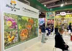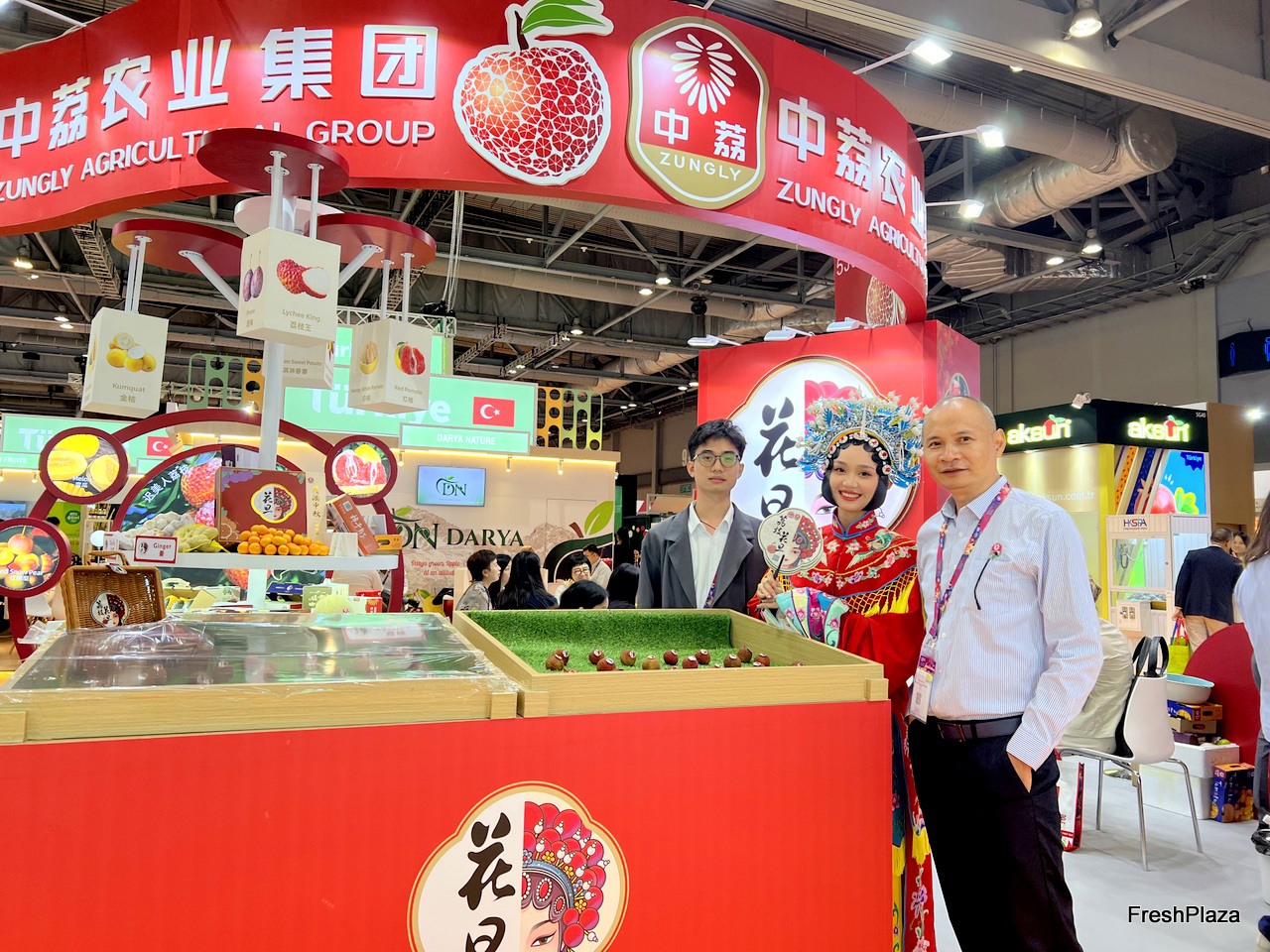 The stand of the Zungly Agricultural Group. The company is promoting its Huadan Lechyee at the show. A representative dressed as Huadan, a character from the Beijing Opera has attracted many visitors' attention./ 中励农业集团展台。该公司在展会上推广其花旦荔枝。身着京剧花旦的代表吸引了众多参观者的目光。