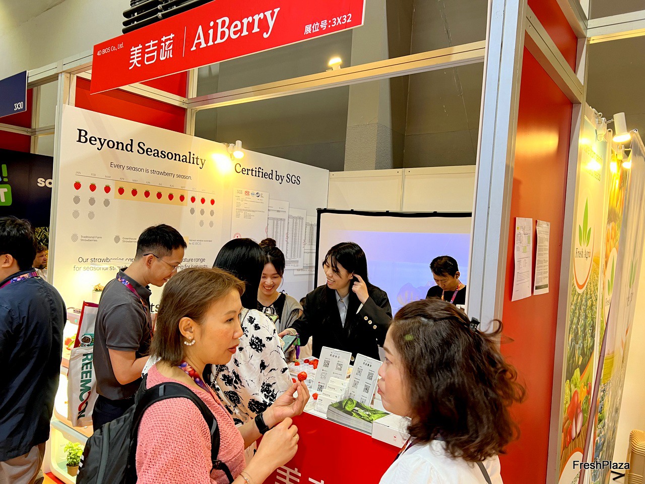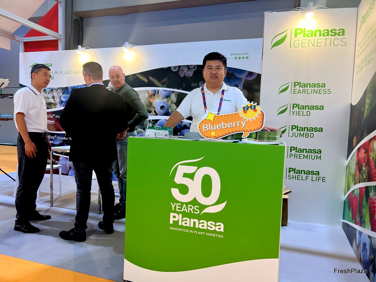 Stand of Planasa, a breeding company from Spain. The company has a wide range of berry varieties for growers. Their products are grown on large areas in Yunnan province. / 来自西班牙的育种公司 Planasa 的展台。该公司为种植者提供多种浆果品种。他们的产品在云南省大面积种植。