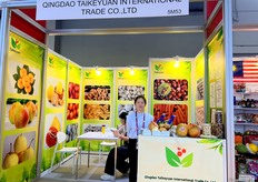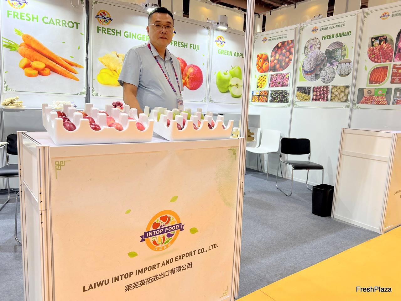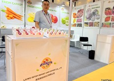 Sales representative at Laiwu Intop Import and Export. Carrot, Ginger and apple are their main products. / 莱芜英拓进出口有限公司销售代表。胡萝卜、生姜和苹果是他们的主要产品。