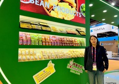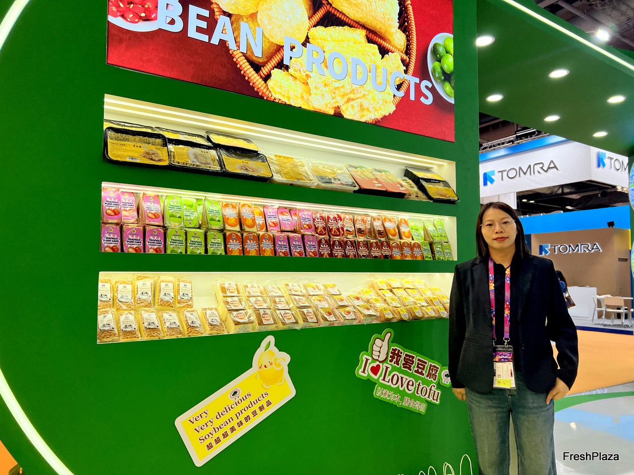 Tofu product display at the stand of Maoxiong, a vegetable grower and exporter based in Guangdong province. The company is now expanding its business to include bean products. / 广东省蔬菜种植商和出口商茂雄的展位上展示的豆腐产品。该公司目前正在将业务扩展到豆制品。