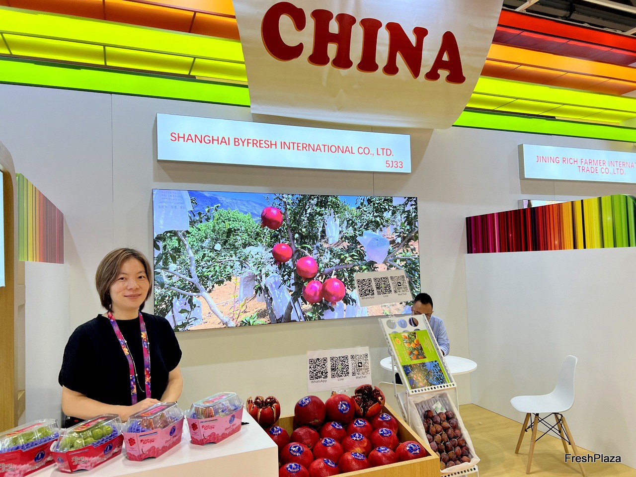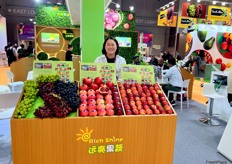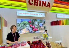Mrs Ivan Tang of Shanghai Byfresh. The company exports a wide varieties of products including grapes, stonefruits and pomegranate. / 上海本圆国际贸易有限公司的 Ivan Tang 女士。该公司出口多种产品,包括葡萄、核果和石榴。