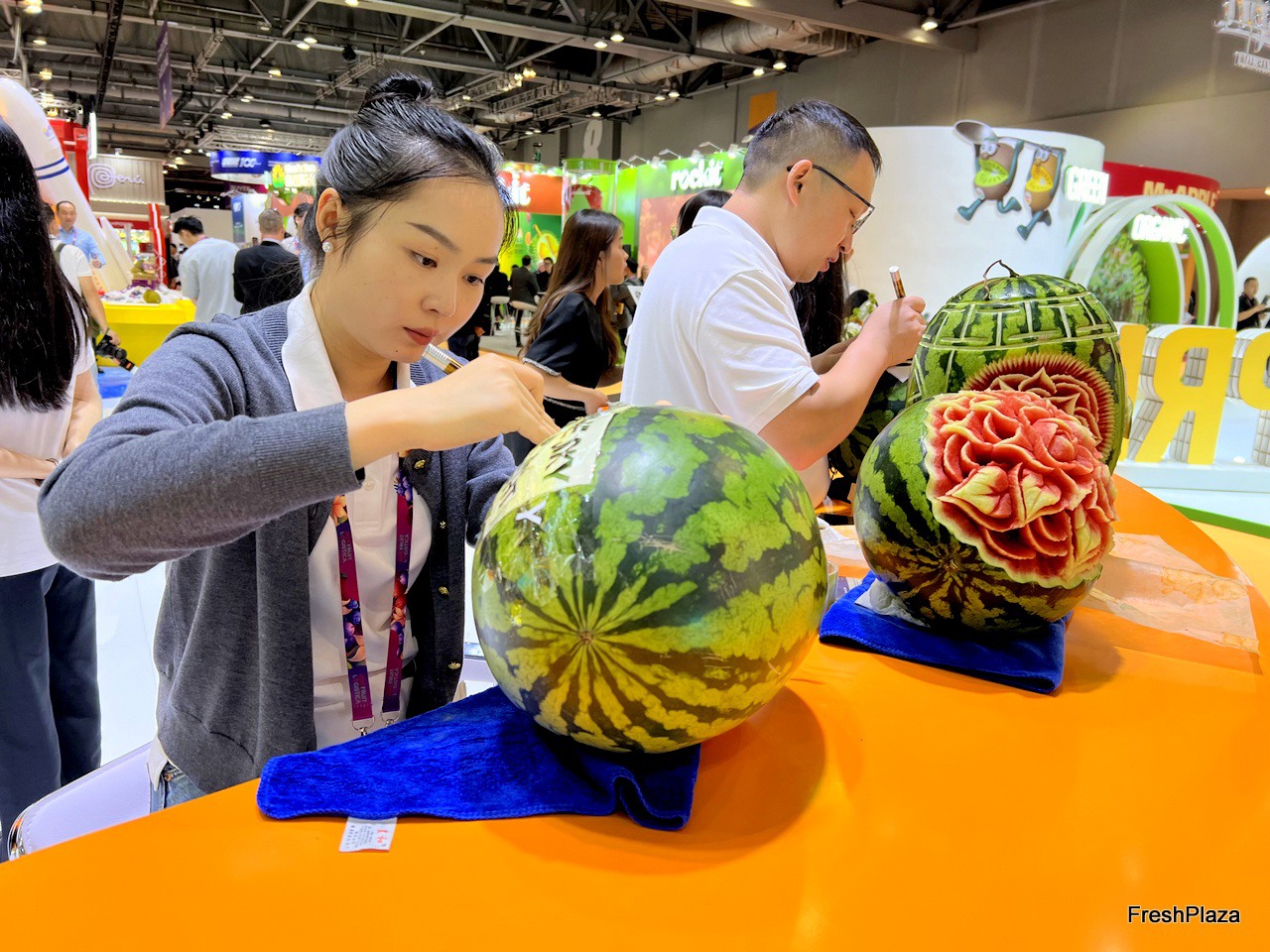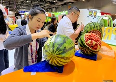 Carving artist is carving with watermelons at the Joy Wing Mau stand. /雕刻师在佳沃鑫荣懋摊位上雕刻西瓜。