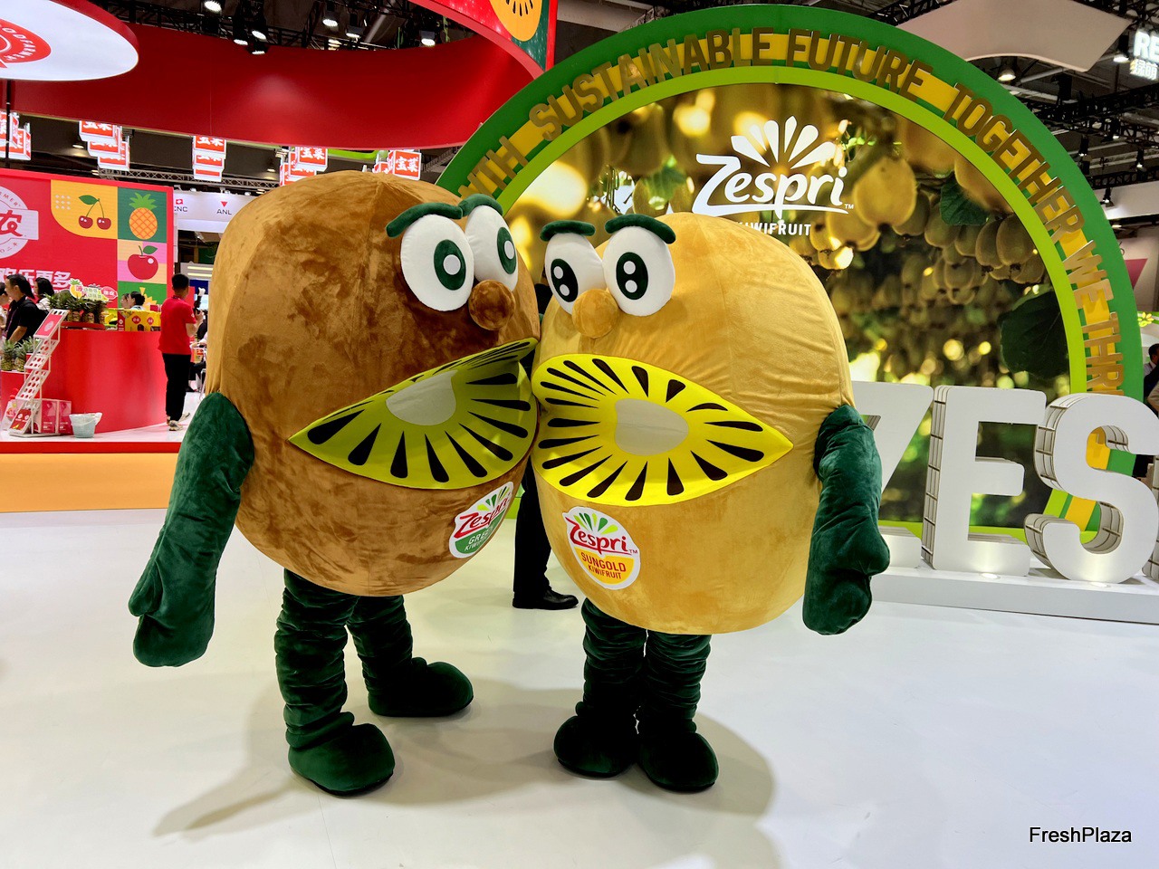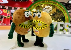 Two large kiwi puppets at the Zespri stand attracted a lot of visitors. / 佳沛展位上的两个大型奇异果木偶吸引了很多参观者。