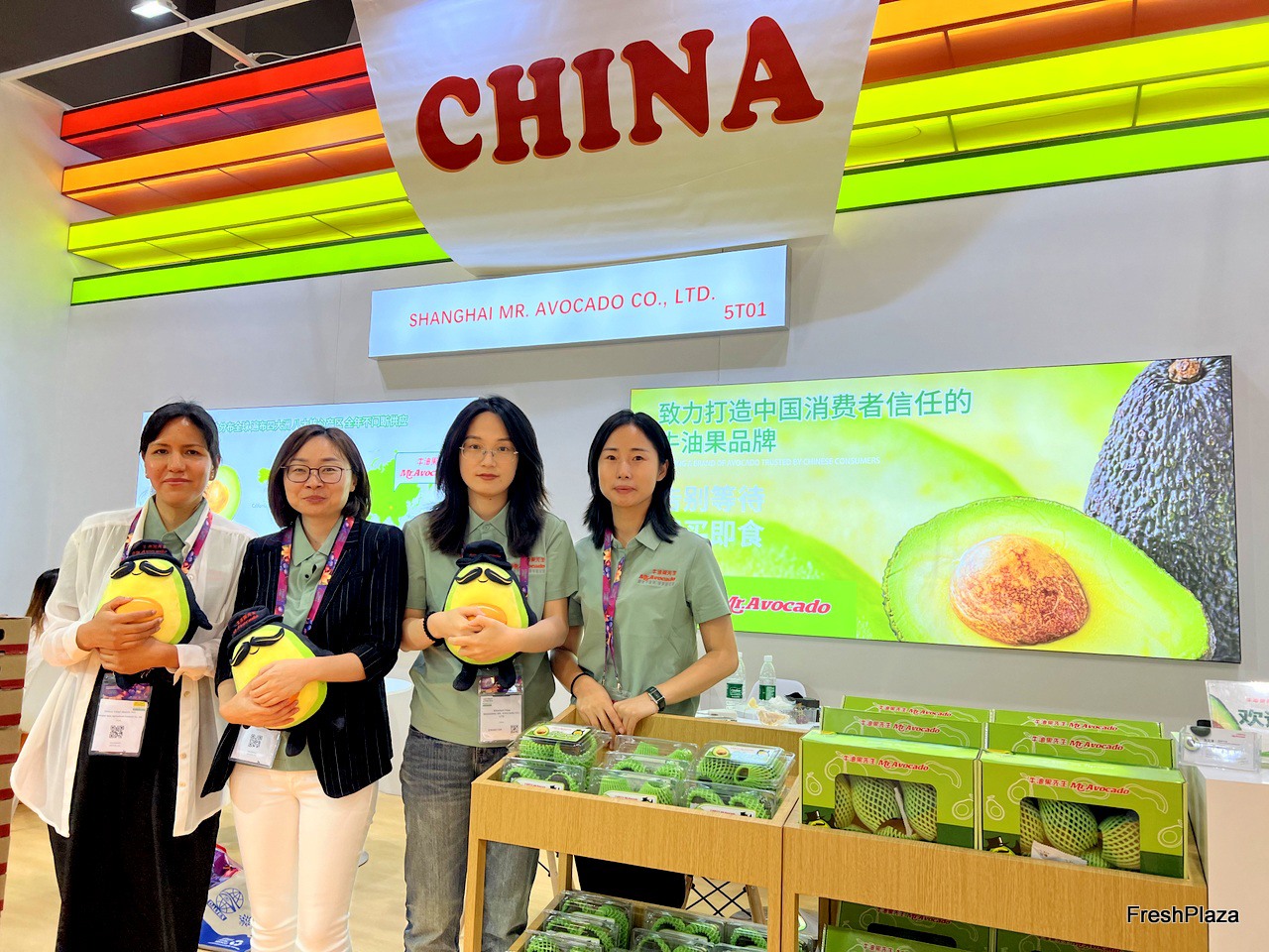 Sabrina (second left) with her colleagues of Mr Avocado, holding their iconic avocado puppet. Avocados are the company's only product. The company imports avocados from around the world for Chinese consumers. / Mr Avocado 展位。Sabrina(左二)和她的同事拿着他们标志性的牛油果木偶。牛油果是该公司的唯一产品。该公司为中国消费者从世界各地进口牛油果。
