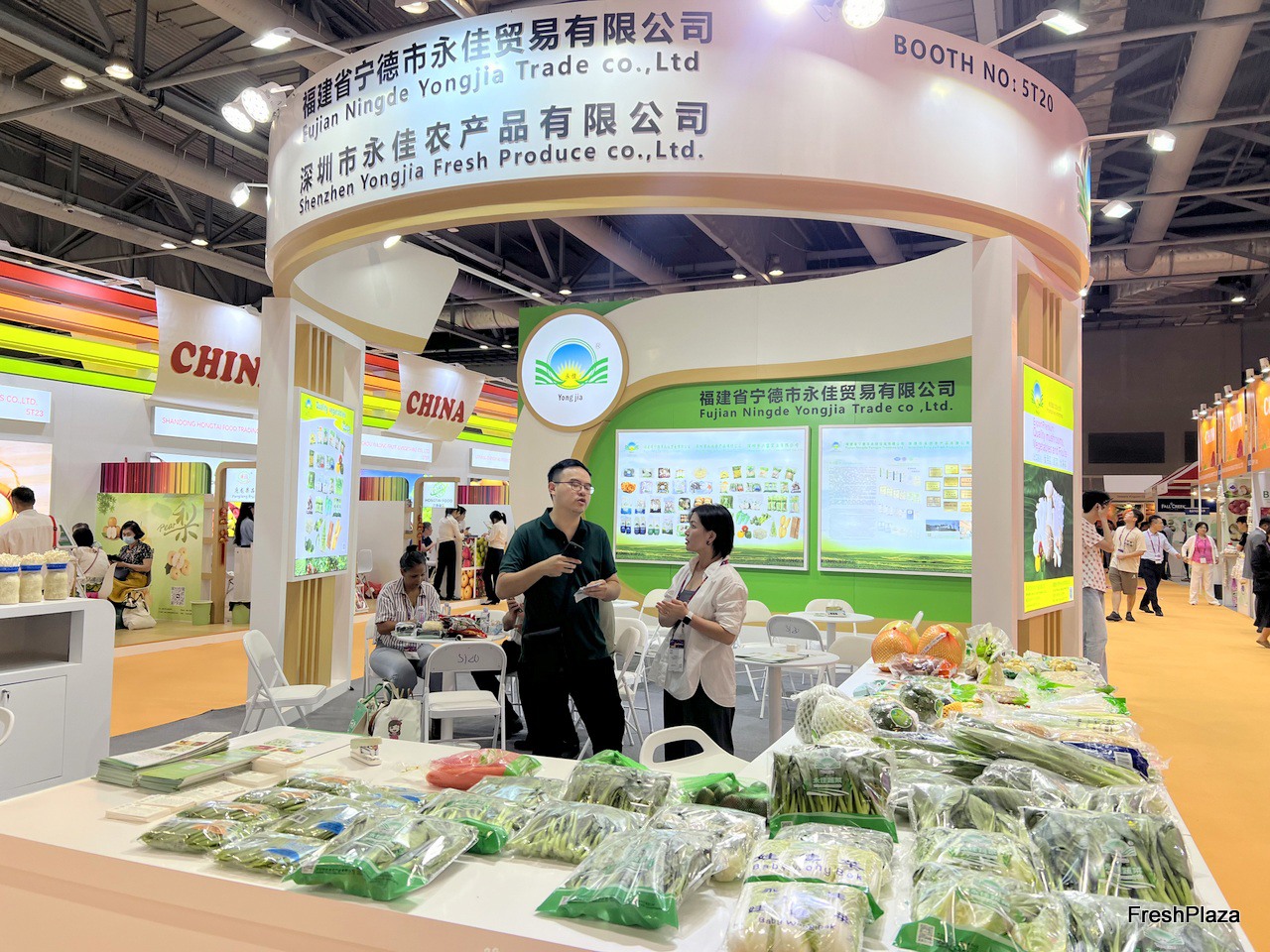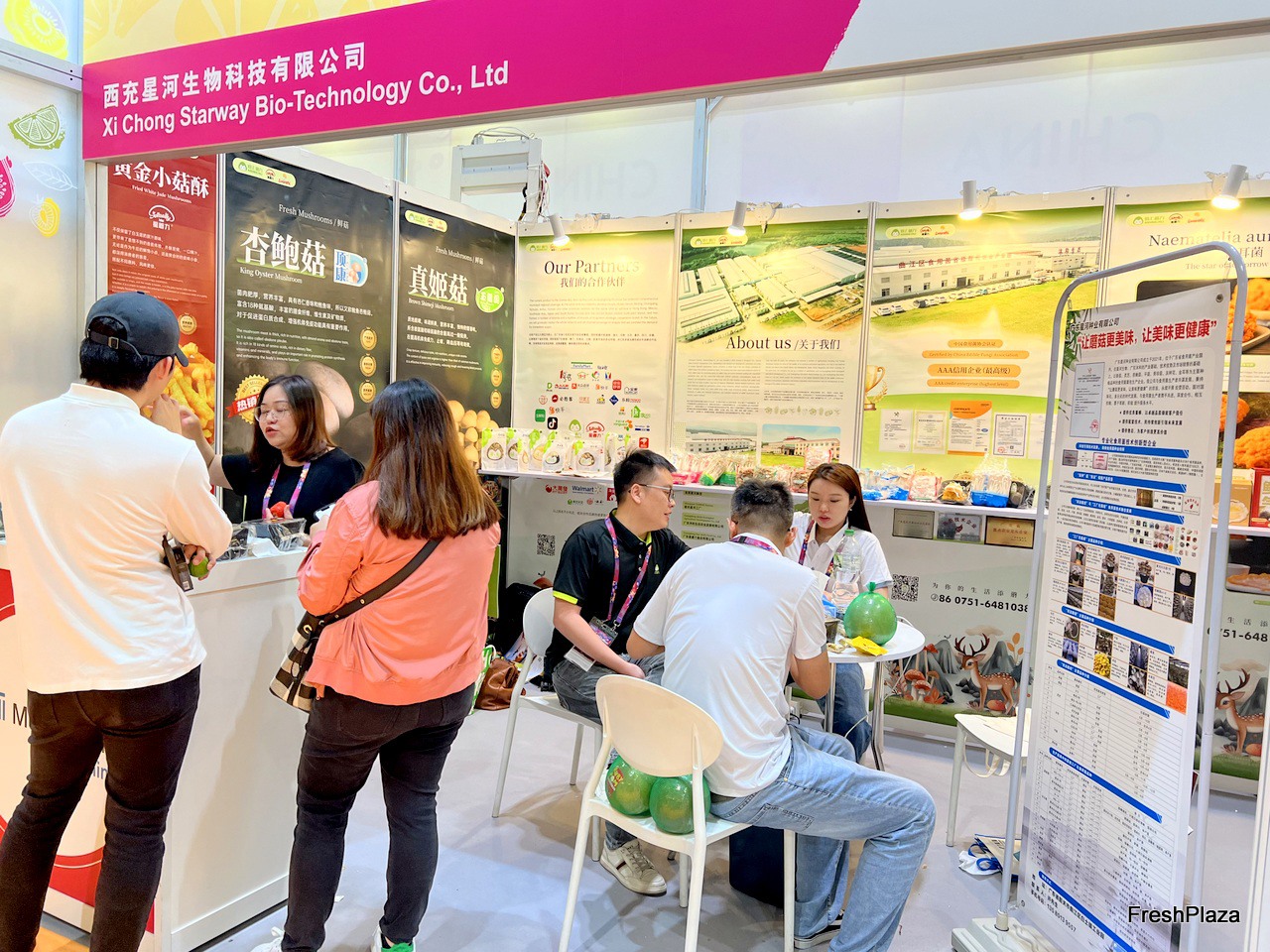 Fujian Ningde Yongjia Trade has a variety of fresh mushrooms and fruit and vegetables on display at the stand. The company sells domestically and exports to over twenty countries and regions. / 福建宁德永佳贸易有限公司展位上展出了多种新鲜蘑菇和果蔬。公司内销并出口二十多个国家和地区。