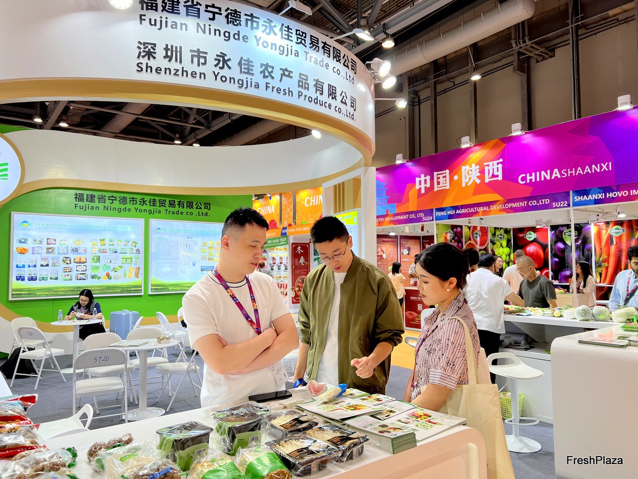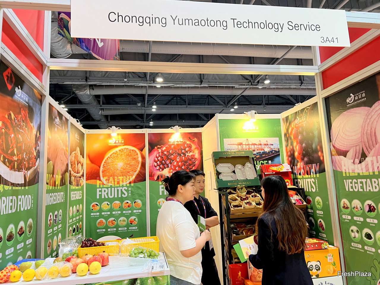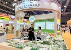 Representative of Shenzhen Yongjia Fresh Produce (left) is talking with visitors at the stand. / 深圳永佳农产品有限公司代表(左)在展位与参观者交谈。