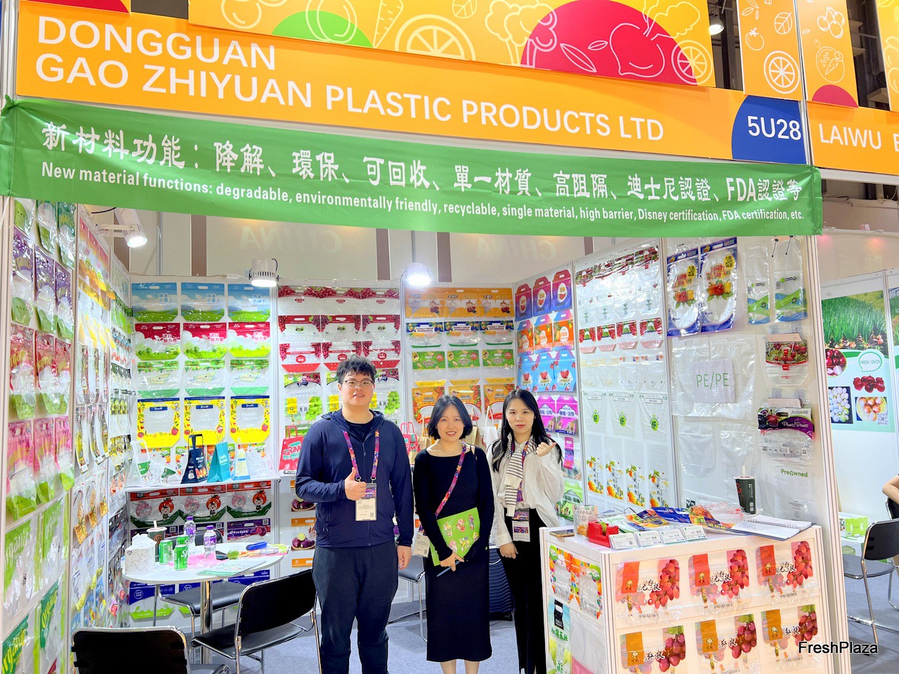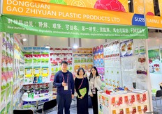 The team of Dongguan Gao Zhiyuan Plastic Products with their product display. The company produces biodegradable packaging materials for fresh produce. / 东莞市高志远塑胶制品有限公司团队及其产品展示。该公司生产用于新鲜农产品的可生物降解包装材料。