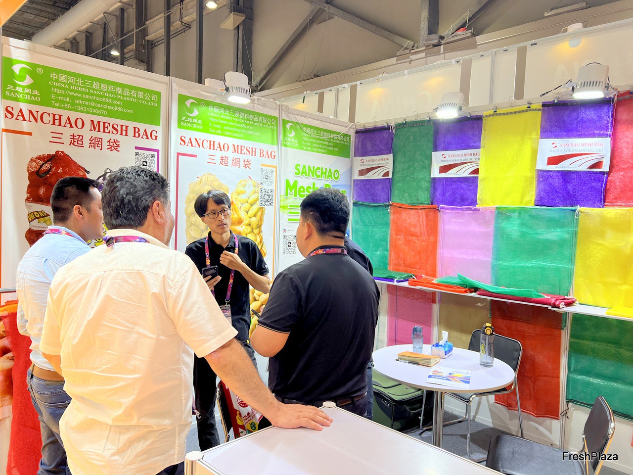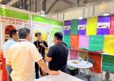 Cicular loom net bags, water loom bags and raschel machine net bags and woven bags are the main products of Sanchao Esh Bag. The company representative is talking with clients at their booth./ 圆织机网袋、水织机网袋、拉舍尔机网袋、编织袋是三超网袋的主要产品。公司代表正在展位上与客户交谈。