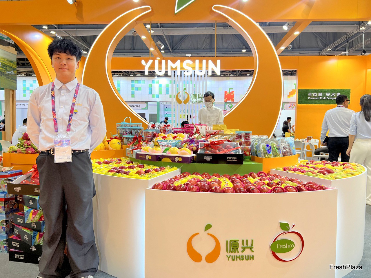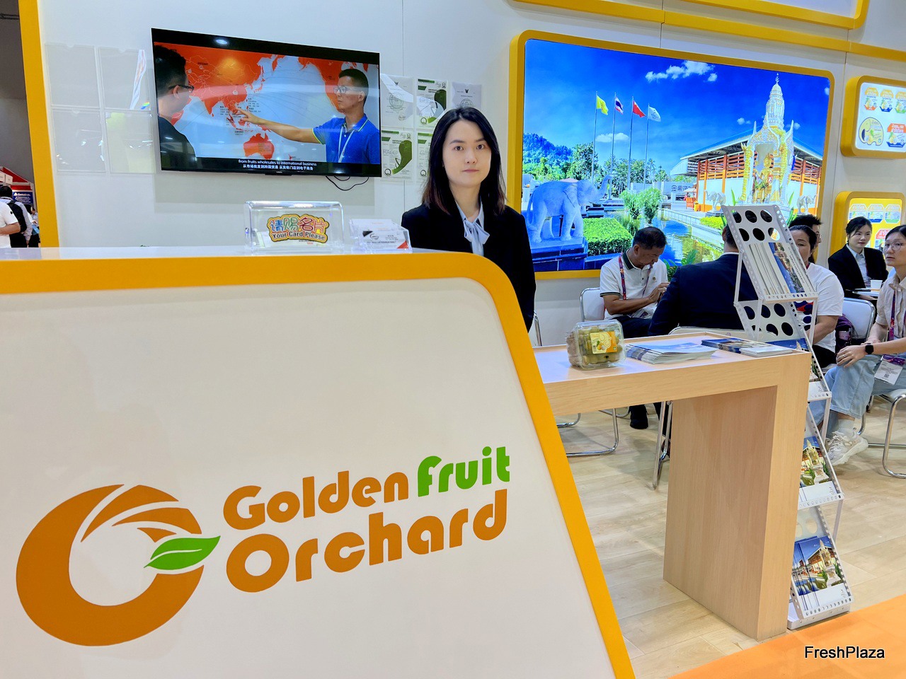 Sales representative at the Golden Fruit Orchard stand. / Golden Fruit Orchard 展位的销售代表。